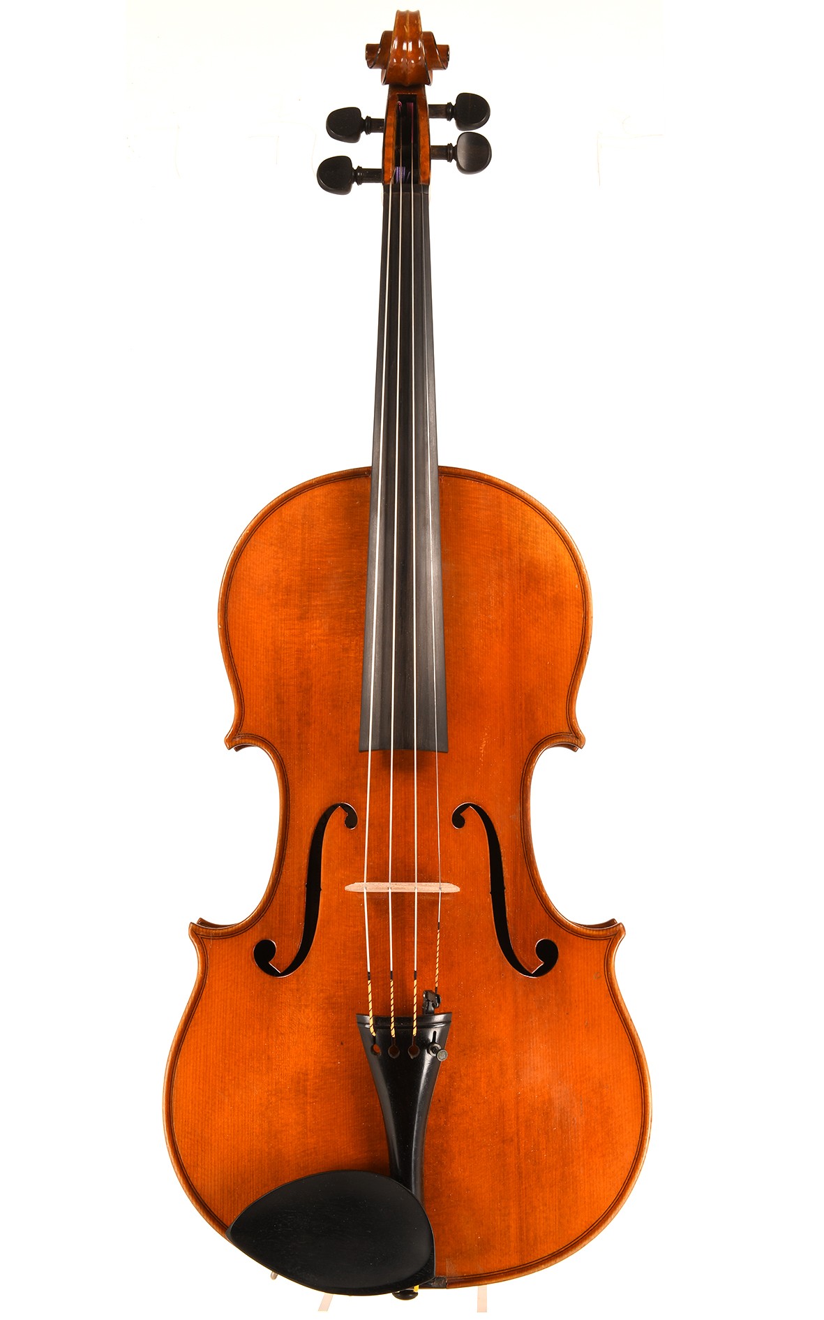 Vermutlich Italienische Bratsche, zugeschrieben Natale Novelli und mit einem entpechenen Zertifikat von Giuseppe Lucci der das Instrument Pedrazzinis Neffen Natale Novelli zuschreibt. Die Bratsche im 42er Solistenformat ist dank leichtem Gewicht sehr angenehm zu spielen. Als typische italienische Arbeit der 1970er Jahre vereint sie eine außergewöhnlich gute Klangqualität mit interessanten handwerklichen Feinheiten, die sich der Erbauer in künstlerischer Freiheit leistete und spektakulär gemaserte, eng geflammten Ahorn für den Boden. So bildet die etwas nachlässige Lackierung einen selbstbewussten ästhetischen Kontrapunkt zur erlesen kraftvollen, engen Flammung des zweiteilig ausgeführten Ahornbodens. Auch die tief gestochene Schnecke zeigt, dass hier eine erfahrene Hand am Werk war, der eine kontrollierte Unkonventionalität durchaus zustand. Als wahre italienische Bratsche erweist sich das Instrument jedoch mit seinem hellen, warmen Klang, der reich an unterschiedlichen Farben ist. Nach einer gründlichen Aufarbeitung in unserer Fachwerkstatt empfehlen wir diese rissfrei und insgesamt gut erhaltene, spielfertige Viola Musikern mit Sinn für das Besondere, die ein Instrument von vollblütigem Charakter zu schätzen wissen.