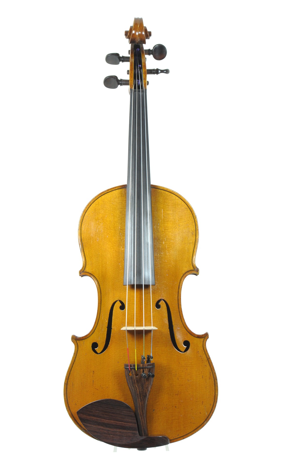 Eine schöne und perfekt erhaltene Markneukirchener Bratsche, gebaut von Nicolaus Bernhard in bester Markneukircher Handwerkstradtion. Der Klangkörper des Instruments misst 38,5 cm und wurde aus besonders feinen Tonhölzern gefertigt. Die Wölbung ist flach gehalten. Die schöne, regelmäßige Maserung der Fichtendecke und der tief geflammte, zweiteilige Ahornboden sind mit einem leicht patinierten, transparenten Lack von leuchtend goldbrauner Farbe lackiert. Feine Details, wie etwa die exakt geschnittenen F-Löcher und die akkurate Randeinlage, sind sauber vollendet. Das antike Instrument ist unbeschädigt und in exzellentem Zustand. Die Bratsche wurde professionell überarbeitet und klanglich optimal eingestellt. Ihr strahlender Klang ist warm, klar, präzise und ausgeglichenen über die Saiten. Besondere Empfehlung!