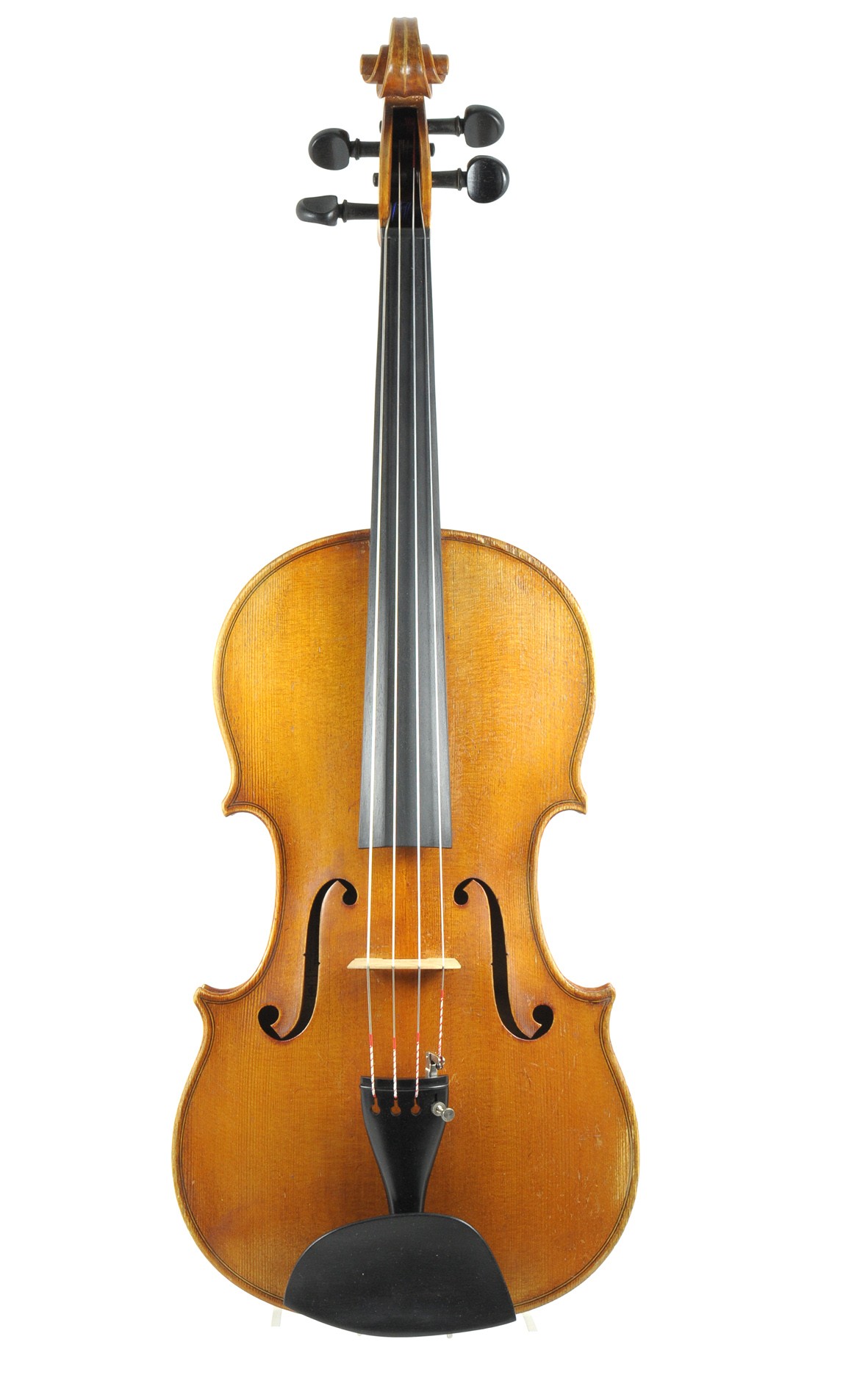 Ein sehr traditionelles Instrument der Mittenwalder Geigenbau Tradition, gefertigt aus besten einheimischen Hölzern des Karwendel-Gebirges ist diese große Mittenwald Bratsche, die um 1950 von Ottomar Hausmann (* 20.5.1923) gebaut wurde. Hausmann kam 1946 mit seinem Vater aus dem böhmischen Schönbach nach Mittenwald und war einer der wenigen Vertriebenen, die sich dauerhaft im oberen Isartal niederließen. Die hier angebotene Mittenwald Bratsche, als echtes Hausmann-Instrument ausgewiesen nicht nur durch ihr Etikett und mehrere Brandstempel, ist sehr gut erhalten und weist nur eine Deckenreparatur auf, die sich verdeckt unter dem Saitenhalter befindet. Ihren freundlich-hellen Lack zieren leichte Patina und wenige Spielspuren. Nach einer gründlichen Durchsicht wurde die Mittenwald Bratsche von unserem Geigenbauer eingestellt und spielfertig gemacht. Ihr warmer, offener Klang ist ausgereift, klar und sehr gut ausgeglichen – unsere besondere Empfehlung!