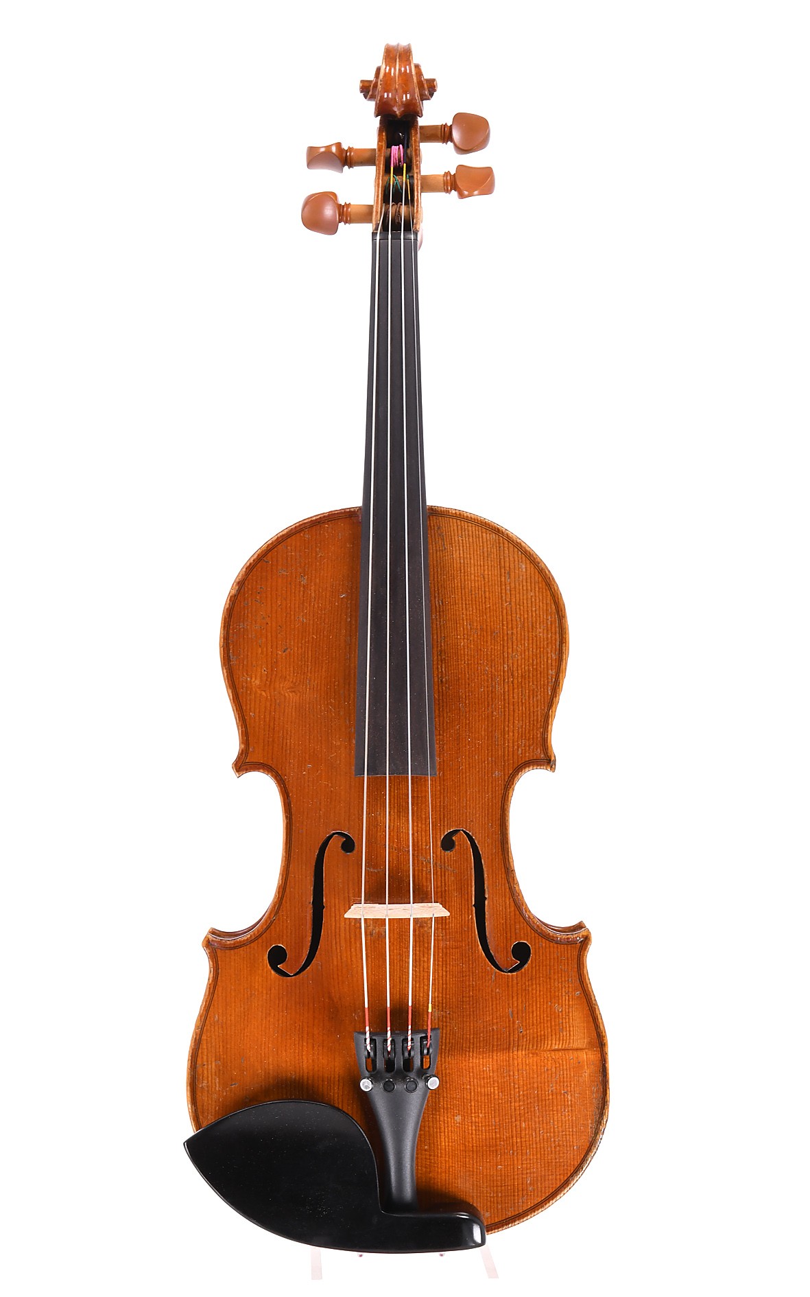 Aus einer der großen, traditionsreichen Werkstätten von Mirecourt stammt diese 3/4-Violine, eine hochwertige und optisch besonders ansprechende Arbeit der Zeit um 1910. Gebaut nach einem breiten Stradivari-Modell überzeugt die 3/4 Geige mit der hohen Qualität der verwendeten Hölzer und ihrer sorgfältigen Verarbeitung. Der stark patinierte und intensiv leuchtende, orange-braune Lack über goldgelbem Grund bringt die mitteljährige Fichte der Decke und den geflammten Ahorn, aus dem der einteilige Boden gefertigt ist, wunderbar zur Geltung. Die rissfrei erhaltene, antike 3/4 Violine wurde in unserer Werkstatt spielfertig aufgearbeitet und erweist sich nicht zuletzt in ihren akustischen Qualitäten als eine wahre Schönheit, mit sehr kräftigem, klarem Klang, der warm, hell und offen ist.