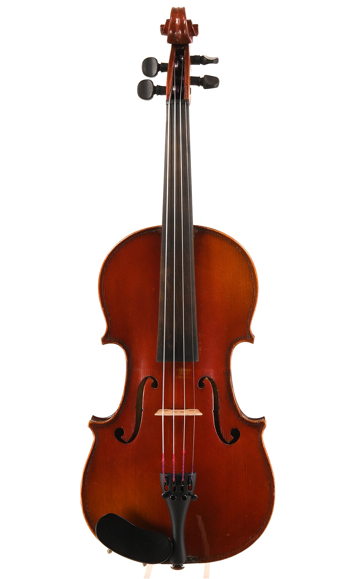 Die J.T.L.-Werkstätten in Mirecourt sind berühmt für die außergewöhnliche Qualität der Handarbeit und den besonders guten Klang ihrer Instrumente. Das gilt auch für die kleineren Größen des J.T.L.-Sortiments, zu dem diese 1/2 Violine "Médio Fino" gehört. Der Korpus dieses hübschen Instruments, welches rissfrei bestens erhalten ist, misst 31,0 cm und ist nur leicht gewölbt. Die Decke besteht aus weitjährigem Fichtenholz, der zweiteilige Boden aus Ahorn. Die Einlage ist - typisch für Médio Finos - angedeutet. Der schöne intensiv leuchtende Lack ist gut erhalten, zeigt nur wenige ältere Spielspuren. Von unseren Geigenbauern aufgearbeitet und in unbeschädigten, aussergewöhnlich gutem Zustand und sofort spielfertig überzeugt die 1/2 Geige vor allem durch ihren warmen, klaren und offenen Klang mit besonders guter Resonanz für eine 1/2 - Violine.