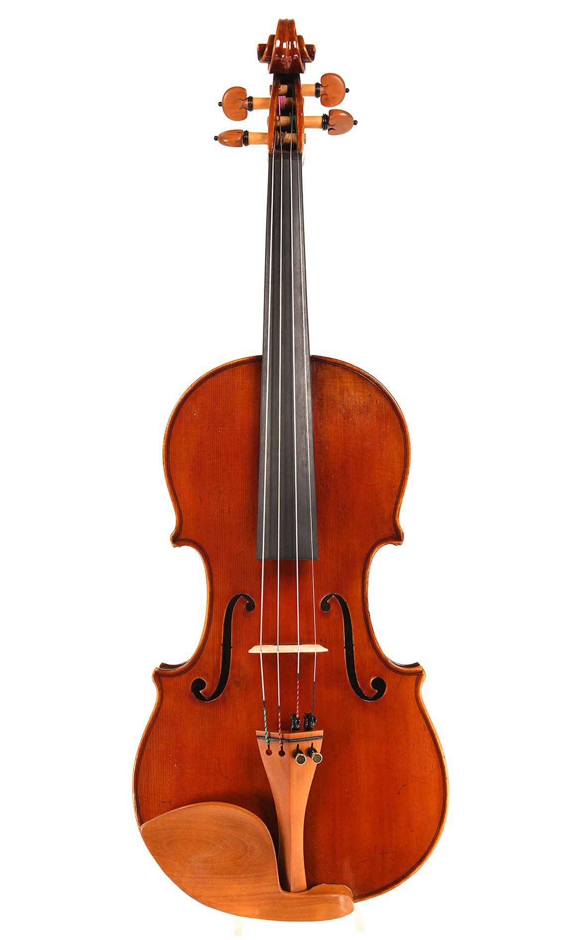 Diese hübsche Bad Homburger Geige von Louis Noebe, die im Jahr 1881 als Kopie von Antonio Stradivari gebaut wurde, ist nicht nur optisch äußerst ansprechend, sondern weist auch für seine Preisklasse außergewöhnlich gute Klang- und Spieleigenschaften auf: Mit sehr leichter Ansprache ist ihr Ton warm und abgerundet, weich, mit Süße in den oberen Bereichen. Der hübsch anzusehende Stradivarinachbau ist aus sorgfältig verarbeiteten wertvollen Hölzern gefertigt. Ein transparenter, dunkelrotbrauner Lack mit dezenten Spuren Musizierens bedeckt die besonders schön gemaserte Decke und den tief geflammten Ahornboden. Ohne Risse und Reparaturen ist Geige technisch in einwandfreiem Zustand, rissfrei, unbeschädigt, von unseren Geigenbauern überarbeitet und ssofort spielbereit.