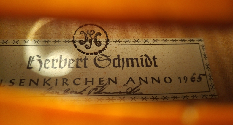 Hervorragende traditionell vogtländische Meisterarbeit ist diese schöne deutsche Meistergeige von Herbert Schmidt, die 1965 in Gelsenkirchen in bester Handarbeit gefertigt wurde. Sie ist ein rares Beispiel feiner handwerklicher Produktion aus einer Zeit, in der sich vertriebene Geigenbauer aus Schönbach und dem Vogtland nach dem Krieg in Wetsdeutschland eine neue Heimat aufbauten. Von auffallend guter Qualität sind der besonders gelungene, dicke Öllack mit goldbrauner Farbe und die hochwertigen Tonhölzer – sehr schöne, mitteljährige Fichte für die Decke, kräftig geflammter Ahorn für den Boden. Ein sehr gut gelungenes Instrument, dessen kraftvoller Klang warm, gereift und reich an Obertönen ist, mit großer Klarheit und Stärke. Wir bieten es in rissfreiem, perfektem Zustand an, überholt in unserer Geigenbauwerkstatt und sofort spielfertig.