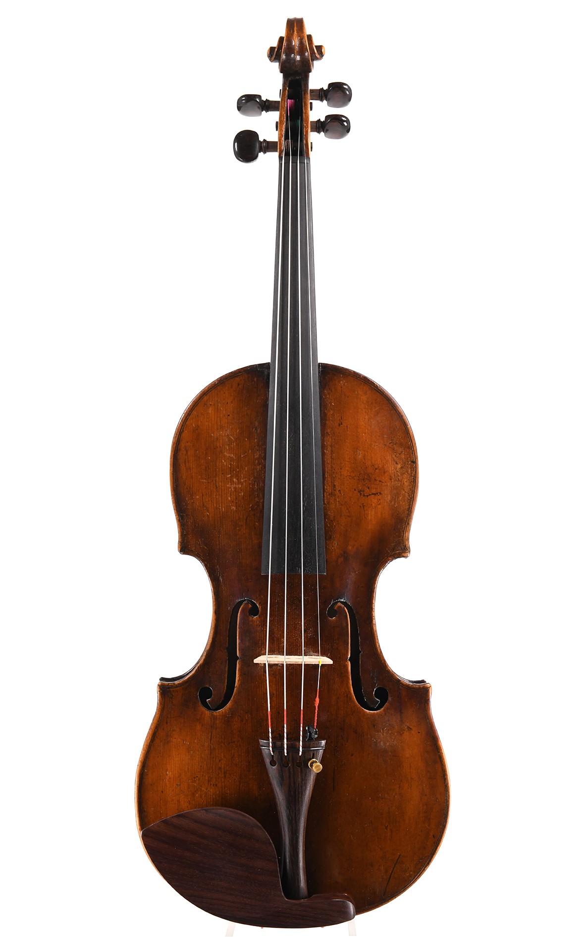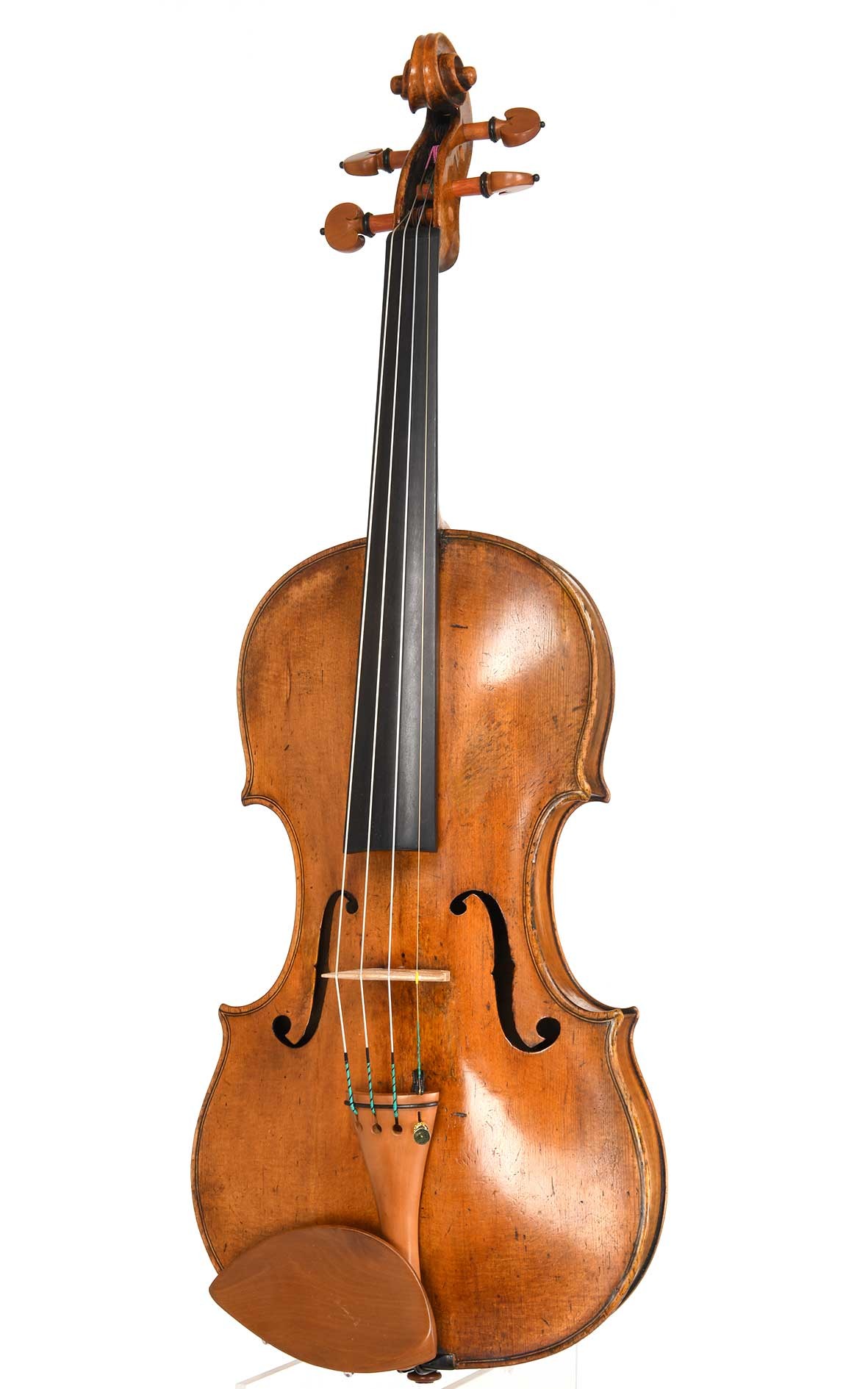 Eine interessante Arbeit der Mittenwalder Klotz Tradition ist diese feine Meistergeige von Anton Rieger, die in äußerst sorgfältiger und sauberer Arbeit um 1780 gebaut wurde. Bauliche Details des schmal ausgeführten Modells lassen eine Nähe zur Klotz Familie erkennen, die über Generationen ein bedeutendes Œuvre geschaffen hat. Die fein- bis mitteljährige Fichte der Decke und der ungeflammte Ahorn des zweiteiligen Bodens sind Ausdruck großer Erfahrung und guten Stils, die sich auch in der feinen Ausführung der barocken F-Löcher und der Randeinlage artikulieren. Der patinierte Lack weist einige Spielspuren auf, die dem hohen Alter der Geige entsprechen, wie auch eine professionell und geschickt ausgefürhte Restaurierung der Decke mit einem Stimmfutter, die den niedrigen Preis von weniger als 50% des Normalpreises begründet. Mit ihrem wunderbar reifen, gealterten, flötigen Klang, der kraftvoll, warm und ausgeglichen ist, demonstriert diese feine Mittenwalder Meistergeige mit Originalzettel von Anton Rieger eindrucksvoll, warum Mittenwalder Instrumenten der Klotz Schule ein vorderer Rang in der europäischen Geigenbaugeschichte zukommt - eine warme, gereifte und doch liebliche Stimme, die in den oberen Bereichen hell und süss ist.