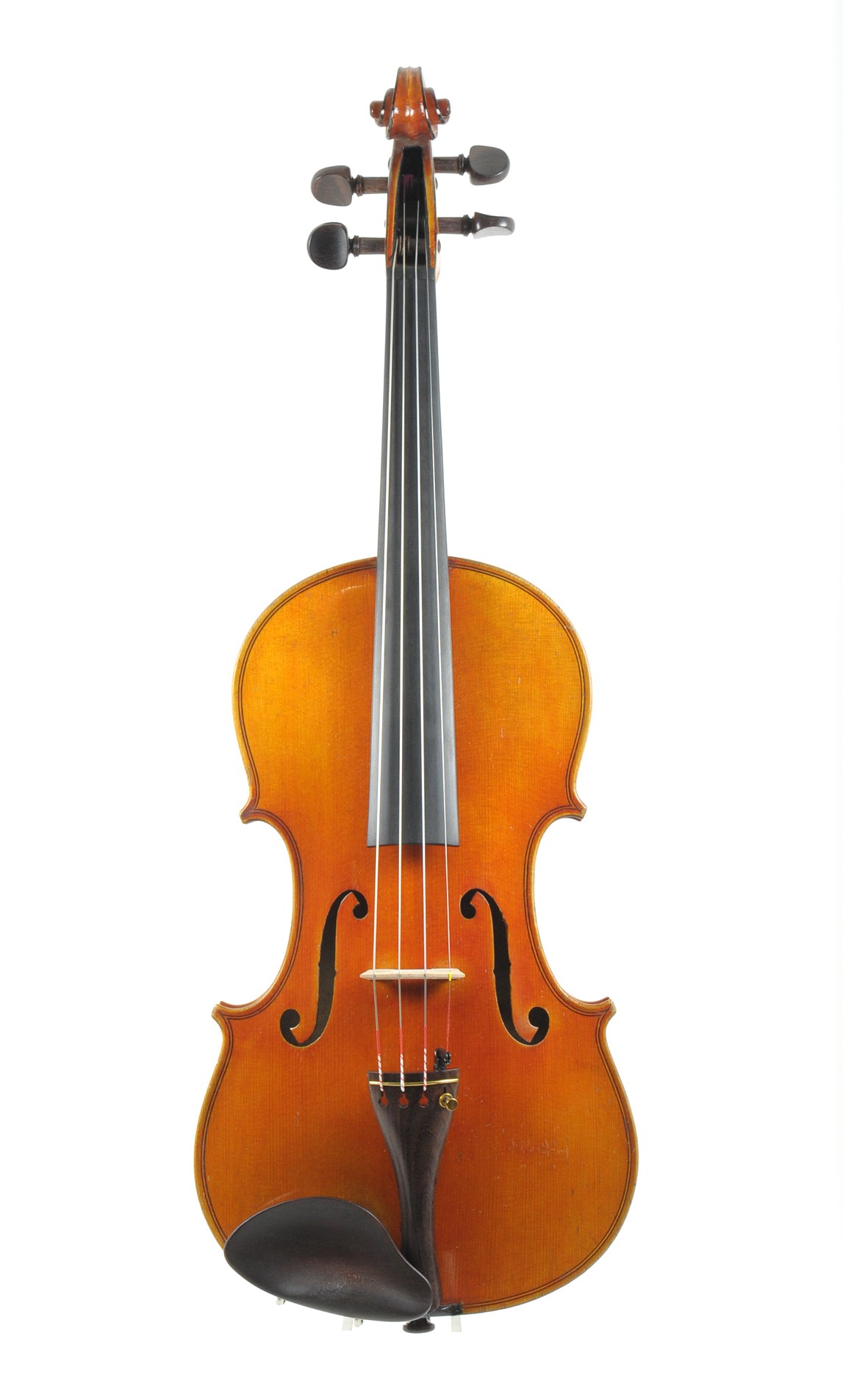 Diese schöne Kopie nach Guernius wurde um 1920/30 in der Werkstatt Leopold Mitschings in Elberfeld gebaut und ist eine der äußerst seltenen Geigen dieser Provenienz. Der 1865 in Düsseldorf geborene Mitsching begann seine Laufbahn als Instrumentenmacher mit der Reparatur von Streichinstrumenten, um ab 1894 in Elberfeld mit größtem Erfolg Instrumente für Militärkapellen zu fertigen. Um 1920 wandte er sich wieder dem Geigenbau zu und fand mit seinen Instrumenten viel Beifall; gleichwohl blieb sein Schwerpunkt in der Militärmusik, und so sind Mitsching-Geigen echte Raritäten. Wie sehr diese Entscheidung zu bedauern ist, zeigt die hier angebotene Geige mit ihrer tadellosen handwerklichen Qualität, vollendeten optischen Erscheinung und ihrem guten Klang. Das feine, nach einem Guarneri-Modell gebaute Instrument ist von eleganter Gestalt und zeigt zur Mitte von Boden und Decke eine gut ausgearbeitete, hohe Wölbung mit sanfter Hohlkehle. Sicher gewählte, attraktive Tonhölzer werden von einem transparenten, leuchtend orangebraunen Lack bedeckt, der besonders die tiefe Flammung des Ahorn-Bodens zu schönster Wirkung bringt. Äußerst sorgfältig und mit elegantem Schwung ist die Schnecke gearbeitet. Wir bieten dieses seltene, qualitätvolle Instrument nach einer gründlichen Durchsicht unseres Geigenbauers spielfertig an und empfehlen seinen starken, obertonreichen und Klang, der klar und von großer Kraft ist.