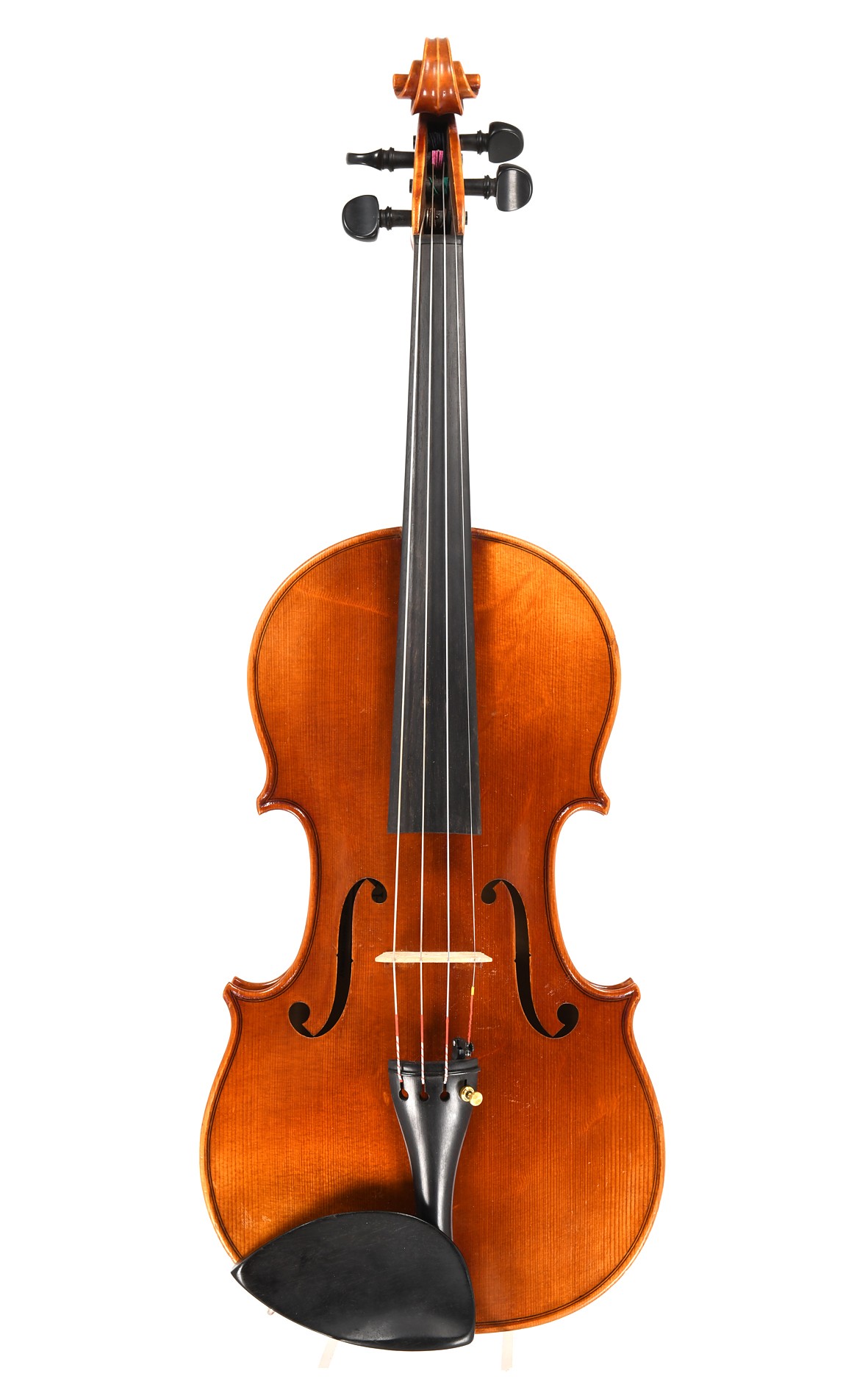 Im bayerischen Mittenwald fertigte Max Hofmann im Jahre 1957 diese feine Mittenwalder Geige, nach dem Modell Stradivari. Hochwertige Tonhölzer aus der Karwendel-Region verarbeitete er in bester Mittenwalder Kunsthandwerkstradition. Decke und Boden sind zweiteilig, die tiefe Flammung des Bodens und die feine Zeichnung der für die Decke verwendeten Haselfichte sind ein Kunstwerk der Natur. In ihrem makellosen Zustand mit orangebraunem Lack in warmen, hellen Goldtönen erweckt diese schöne Mittenwalder Max Hofmann Violine den Anschein, gerade erst die Werkstatt verlassen zu haben - und steht einem modernen Mittenwalder Meisterinstrument, das in dieser Qualität für gewöhnlich nicht unter 15.000 € zu haben ist, in nichts nach. Ihr warmer, heller, offener, klarer und starker Klang ist von sehr guter Qualität.