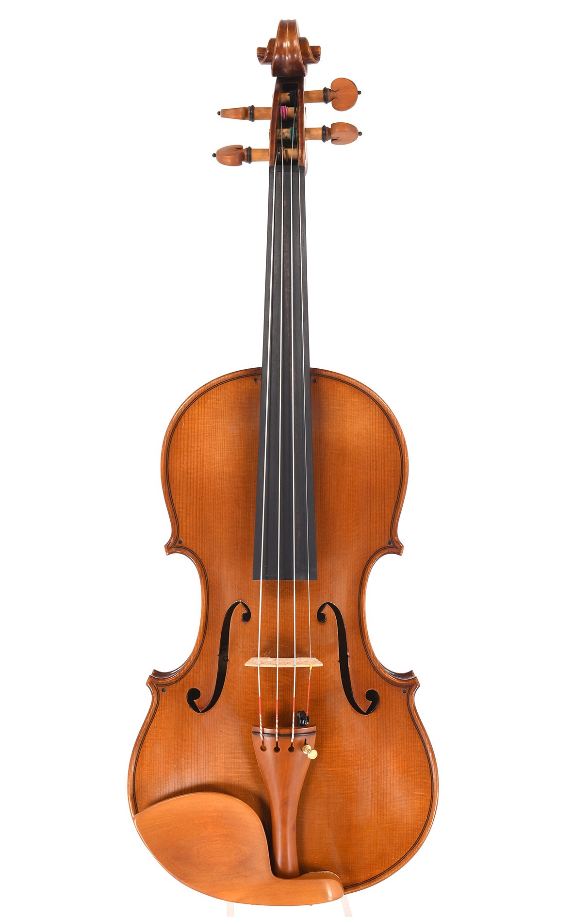 Diese moderne französische Violine ist ein ausgesprochen hübsches Instrument, mit dem der Mirecourter Geigenbauer René Morizot eine Arbeit von höchst eleganter Erscheinung und ausgezeichneter musikalischer Qualität geschaffen hat. Die Geige reflektiert die Zeit, in der der Sohn des berühmten Bogenmachers Louis Morizot in der vollkommenen Unabhängigkeit seiner eigenen Werkstatt arbeitete – und sich damit auf dem vorläufigen Höhepunkt eines Lebensweges befand, der keineswegs einfach gewesen war: Nach den ersten Jahren als einziger Geigenbauer in der familiären Bogenbau-Werkstatt „Morizot, père et frères“ und einem ersten Aufbruch in die Selbständigkeit 1939, der von Krieg und Gefangenschaft unterbrochen wurde, konnte er sich nun ganz seinem Handwerk widmen und hatte sich Ende der 1950er Jahre mit Erfolg etabliert. Wenige Jahre bevor er als Leiter der École nationale de lutherie in seiner Heimatstadt Verantwortung für die Ausbildung der folgenden Generation von Geigenbauern übernehmen sollte, schuf er mit der hier angebotenen Geige, seinem opus 122, eine interessante Interpretation des klassisch-italienischen Amati-Modells. Aus mit größter Sensibilität gewählter, feinjähriger Fichte und zart geflammtem Ahorn mit einer wunderschönen, milden und doch markanten Maserung formte er den hoch gewölbten Korpus, dessen zweiteiliger Boden ein Meisterwerk präziser Handwerkskunst ist. Ein reizvoller, sorgfältig aufgetragener orangebrauner Lack vollendet das harmonische Bild der exzellenten Tonhölzer und ist mit äußerst wenigen Spielspuren hervorragend erhalten, wie sich das gesamte Instrument in bestem, unbeschädigtem Zustand befindet. Die handschriftliche Signatur Morizots im Inneren des Korpus beleget die Herkunft dieser Geige, die in unserer Fachwerkstatt vollständig aufgearbeitet und spielfertig hergerichtet wurde. Der unverkennbare französische Charakter ihres kraftvollen, strahlenden Klanges ist von bezaubernder Klarheit, die sich mit interessanten dunklen Farbtönen zu einer selten zu hörenden, edlen Stimme vereinigt.