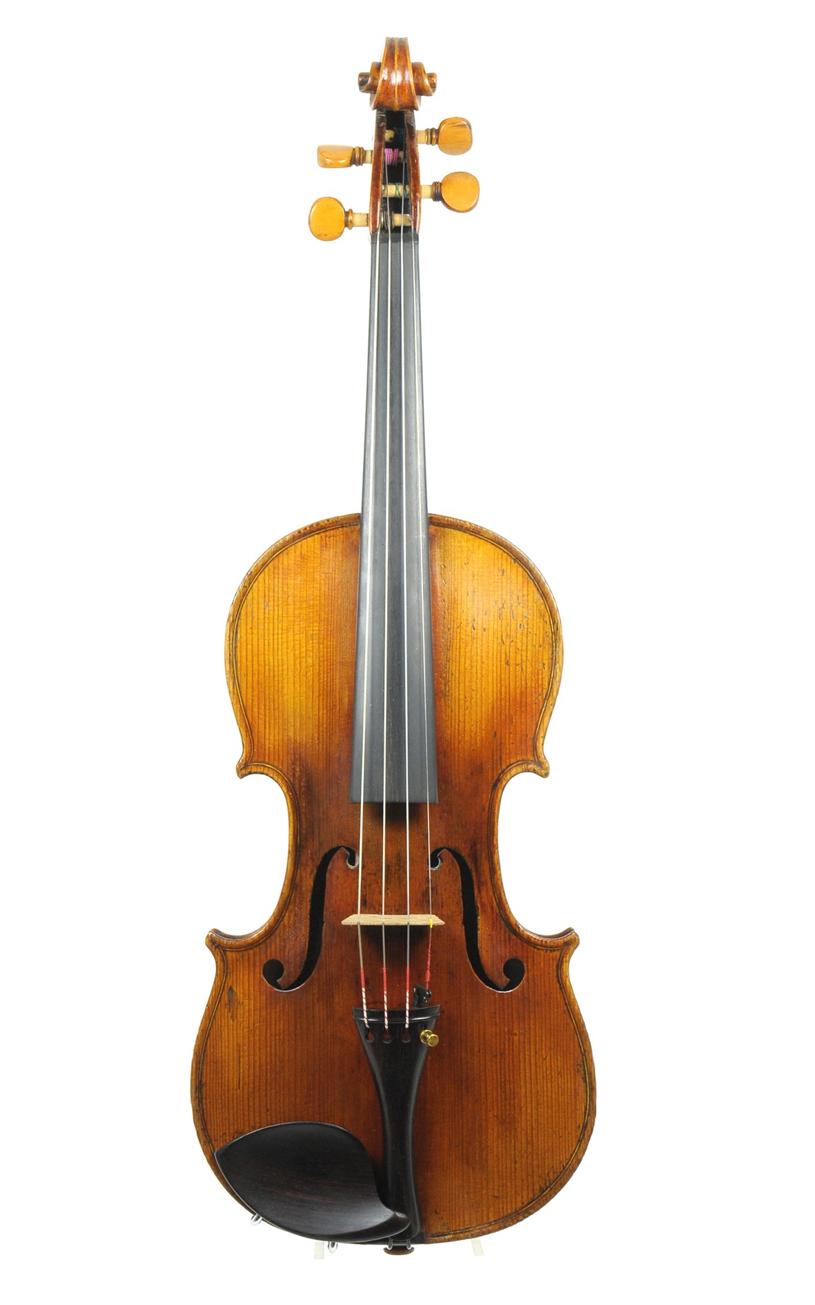 Ein auf das Jahr 1814 datiertes Etikett schreibt diese vorzügliche englische Geige dem Londoner Geigenbauer Samuel Gilkes zu, einem hochtalentierten Meister, der sich in der vergleichsweise kurzen Zeit seines Wirkens einen ausgezeichneten Ruf erwarb. Ein Kaufbeleg von 1974 gibt einen weiteren Hinweis auf die Herkunft der hier angebotenen Geige aus Gilkes Werkstatt, die wir gleichwohl nicht bestätigen können. Das zierliche Modell ist jedoch von dezidiert englischem Charakter. Charaktervolle, feine Handwerkskunst zeigen die weit ausgezogenen Ecken und der einteilig ausgeführte Boden; die weitjährige Fichte der Decke prägt durch den leuchtend orangebraunen Lack, der auf einer hellen Grundierung aufgetragen wurde, die antike Erscheinung der Geige. Angesichts ihres hohen Alters ist diese Violine ausgezeichnet gut erhalten und weist nur wenige, klanglich unbedeutende Restaurierungen an Schnecke und Wirbelkasten sowie an den Zargen auf. Unsere Geigenbauer haben dieses interessante englische Instrument mit größter Sorgfalt aufgearbeitet und spielfertig hergerichtet. Ihrer vermutlichen Provenienz macht der schöne und farbenreiche Klang der Geige alle Ehre, eine reife, warme und dunkle Stimme mit der besonderen Note alter Streichinstrumente.