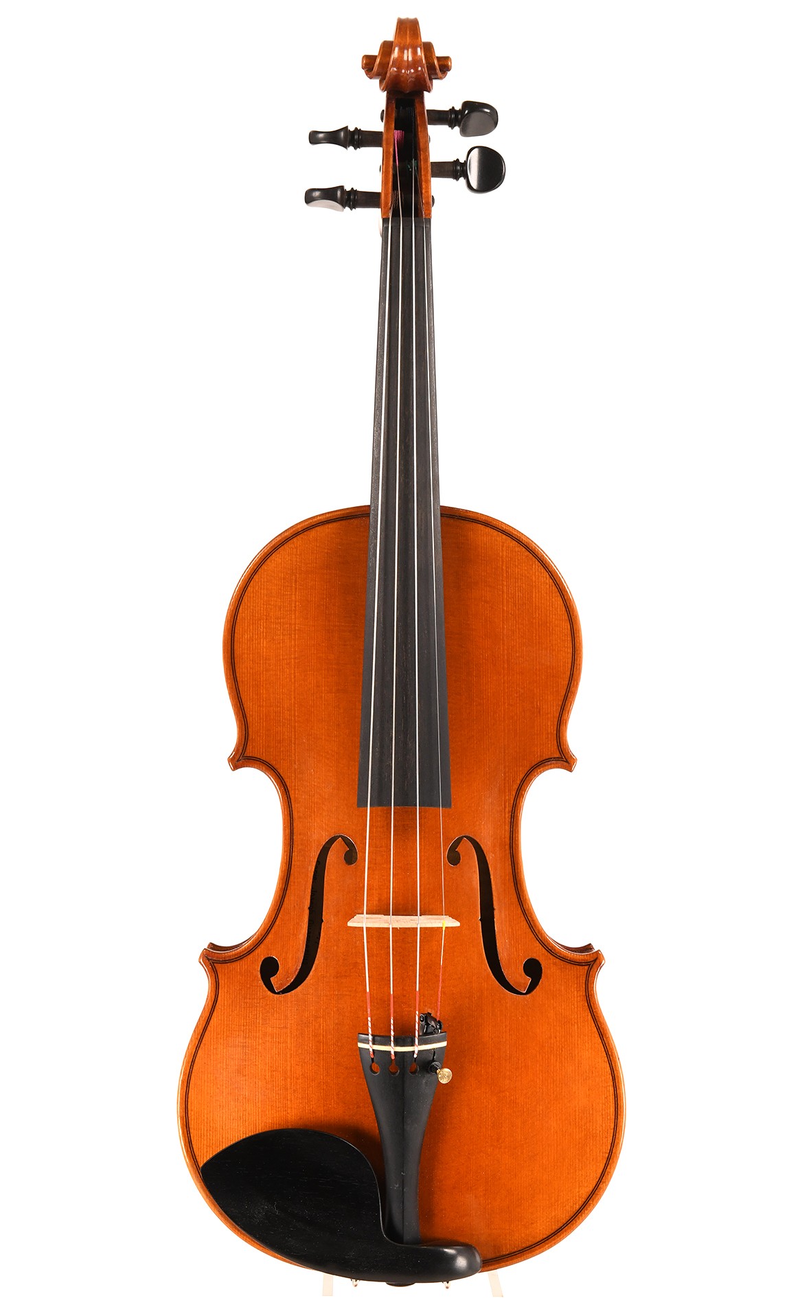 库尔特-居特(1894年-1991年)是一位由奥斯卡-伯恩哈德-海涅尔培训的多才多艺的马克纽基尔小提琴制造者,从20世纪50年代起,他专门制作最优秀的大师级小提琴,在国际小提琴制作比赛中赢得了该类型的许多奖项。这里提供的瓜奈里大师的小提琴是在居特被授予民主德国乐器制作一等荣誉奖的前一年制作的,它代表了这位大师工作的最成熟阶段,他的工作已经到了晚年。丰富闪亮的橙褐色油性清漆让窄到中等纹理的云杉木面板的美丽纹理和两片式枫木背板的强而深的火焰闪耀着无暇的光彩,辉煌、温暖和良好支持的声音证明了这些高质量的音木在声学上也是一个很好的选择。它是为一位收藏家定制的乐器,至今没有被演奏过,处于极好的原始状态,我们的制琴师在彻底检查时确信了这一点,在检查期间,它被准备好演奏。