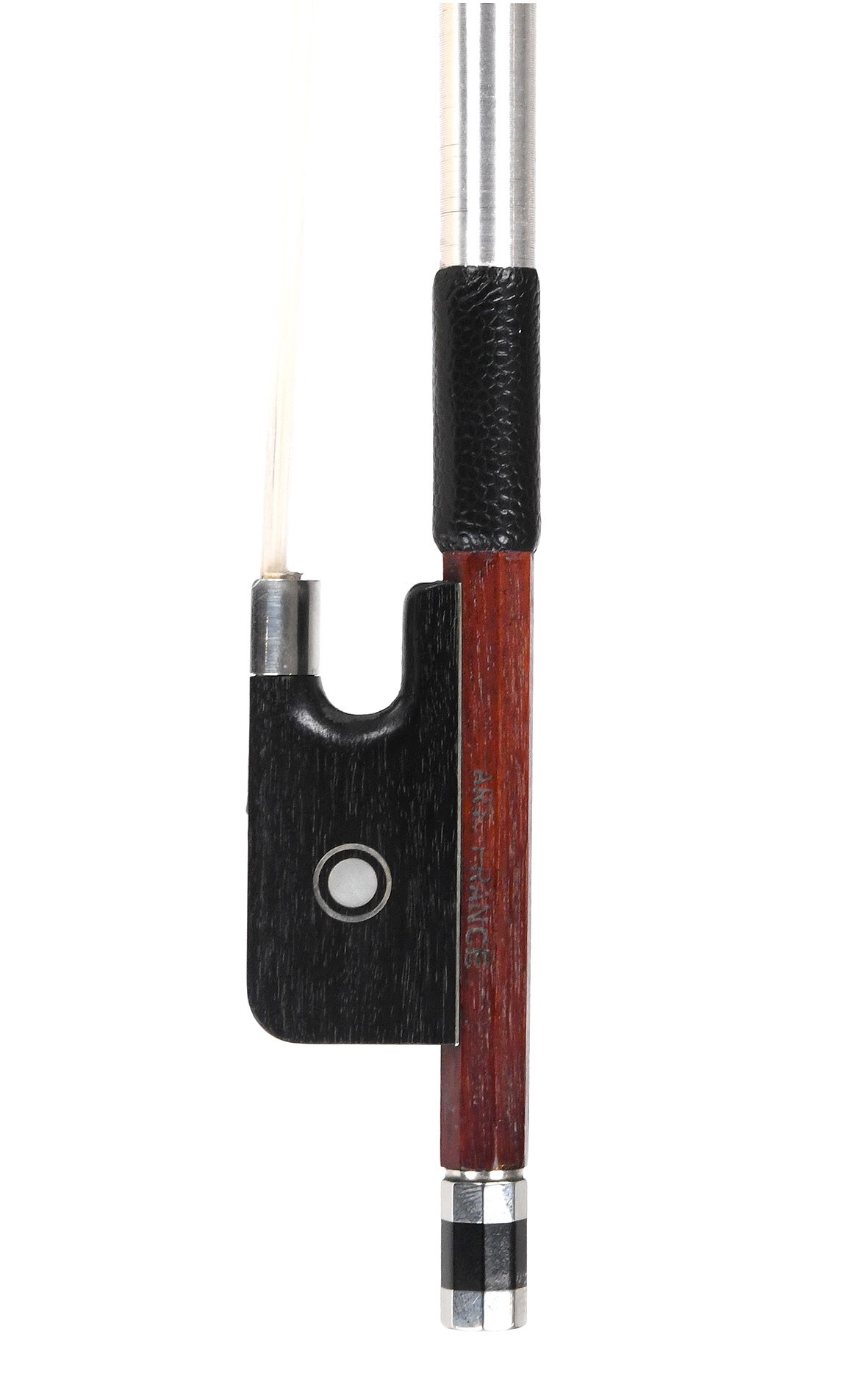 Cet archet d'alto français de la maison Ary France a été fabriqué dans les années 1980 à Mirecourt. L'archet d'alto avec son cachet d'origine joue avec force, avec un son clair et puissant, et un grand son français. La forte baguette ronde de l'archet d'alto a été fabriquée à la main, en bon français. La grenouille d'archet, en ébène et maillechort, est ornée d'une patte en trois parties et d'un bel œil parisien. L'archet d'alto pèse 71,3 g et son centre de gravité est assez centré, légèrement vers la pointe. Un bel archet d'alto français, puissant et d'usage universel, avec une nouvelle pilosité, prêt à jouer comme tous les instruments et archets Corilon. L'archet produit un son clair, net et puissant.