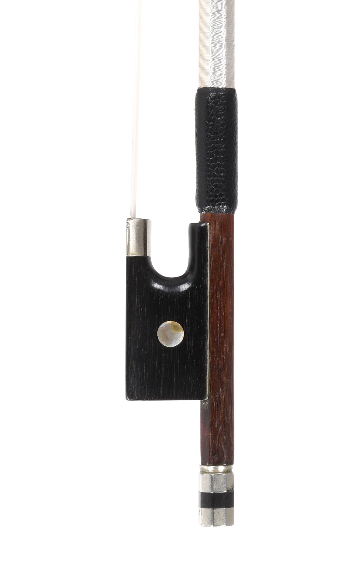 Cet archet français léger de Charles Nicolas Bazin, construit vers 1880, est d'une beauté et d'une élégance particulières. BAZIN en bois de Pernambouc de qualité supérieure, qui produit un son clair et doux et qui a été créé à la fin du 19e siècle vers 1880 à Mirecourt. La baguette est ronde et élastique, le bois brun rougeâtre d'une structure et d'un éclat magnifiques. La grenouille en ébène noire, qui porte de petites traces du temps, plaît par sa forme claire et est dotée d'une monture en slber. L'archet de violon mesure 74,4 cm, son centre de gravité ressenti se situe au milieu, légèrement dans la moitié inférieure. Cet excellent archet Charles Nicolas Bazin, prêt à jouer, tient très bien dans la main et se joue activement, tout en produisant un son clair, chaud, noble et résonnant. Certificat de valeur inclus.