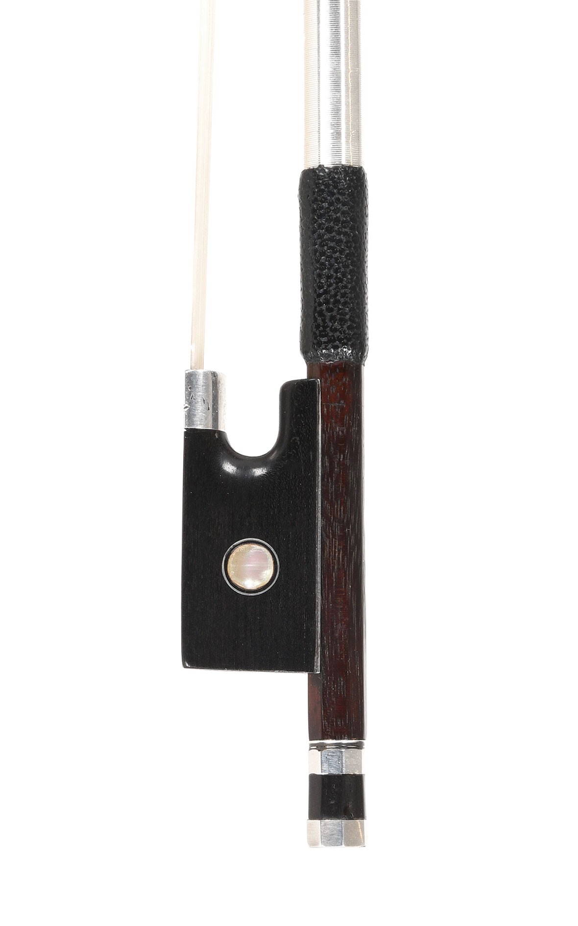 Fin archet de maître allemand, en argent, un travail de la famille Knopf, Markneukirchen. Cet archet de violon a été créé dans les dernières années du 19e siècle. Son caractère unique réside dans sa tête bicolore, large et dressée, et dans sa baguette robuste et élastique en pernambouc brun foncé très fin. La grenouille en ébène a été dotée d'un œil en nacre et d'une précieuse monture en argent massif. La répartition centrale du poids de la tige de section ronde révèle un savoir-faire de maître ; le centre de gravité est mesuré à 26,5 cm, y compris la longueur de la patte. Avec une longueur de 73,9 cm, l'archet pèse environ 59 g. Un magnifique archet de maître pour musiciens exigeants, qui produit un son clair et doux, fluide et résonnant - avec des traces de jeu, mais en parfait état.