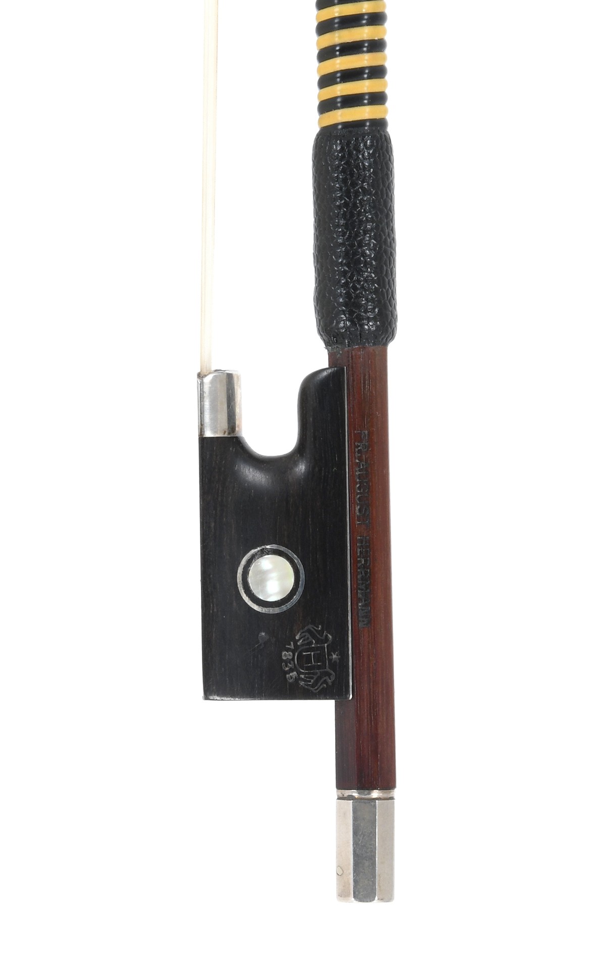 Archet de violon allemand d'August Herrmann, Markneukirchen ; l'une de ses dernières œuvres, avec les poinçons d'origine sur la baguette et la hausse.