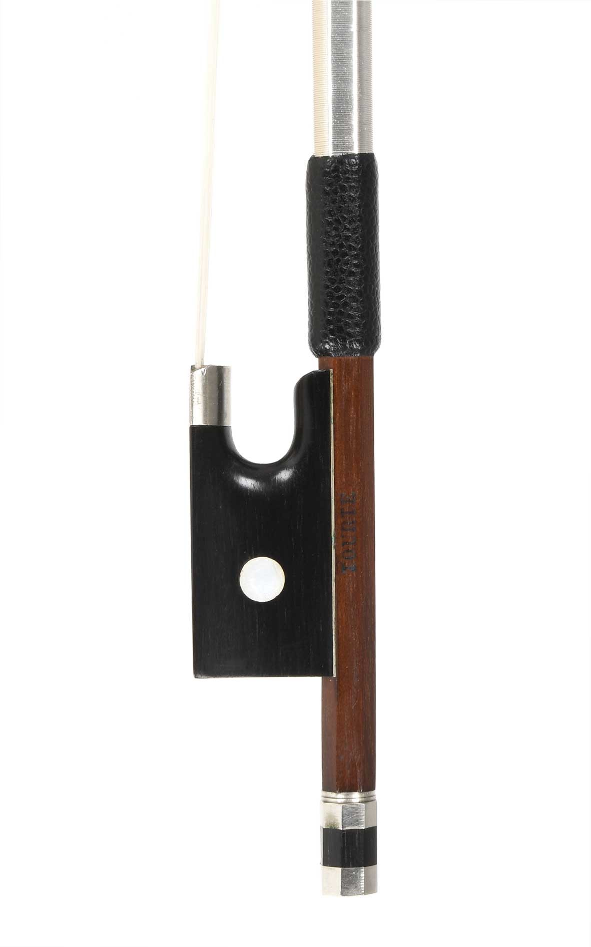 Ancien archet de violon français avec d'excellentes caractéristiques de jeu et de sonorité de Charles Nicolas Bazin, construit vers 1900. L'élaboration de la baguette ronde fixe en bois d'abeille suit son propre modèle, vers lequel C. N. Bazin s'est à nouveau tourné de manière renforcée à cette époque - suivant une tendance de son œuvre qu'il avait dû longtemps mettre de côté après la mort...