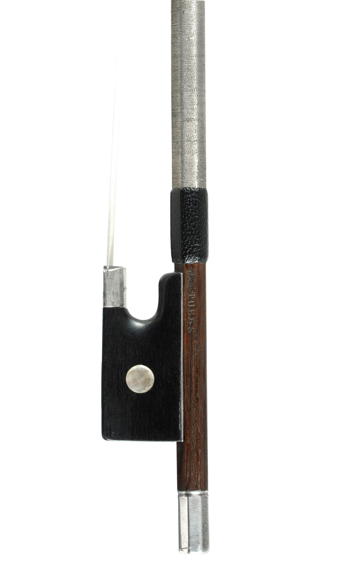 Cet archet de violon d'une beauté parfaite de l'archetier anglais James Tubbs (1835-1921) a été créé au début du 20e siècle et est un chef-d'œuvre de maturité de la phase intermédiaire de son œuvre. La baguette élastique et d'épaisseur moyenne est fabriquée en bois de Pernambouc de la meilleure qualité, dans la forme caractéristique de James Tubbs avec une section ronde. Elle porte le cachet personnel "JAS TUBBS", qu'il utilisait depuis la fin des années 1870 pour éviter toute confusion entre ses travaux et ceux de son frère John notamment. Le faible poids de l'arc, qui ne pèse que 55,1 g, est réparti de manière idéale et magistrale, avec un centre de gravité ressenti vers la pointe, mesuré à 25,3 cm de la longueur totale de 74,5 cm (y compris la jambe). La finition raffinée avec une grenouille en ébène montée en argent et une plaque de tête argentée souligne la qualité de cet archet de violon James Tubbs de manière peu spectaculaire mais d'autant plus efficace. Précis et bien défini, il produit un son clair avec une douce nuance, prêt à jouer après une révision approfondie dans notre atelier spécialisé. Un certificat du célèbre expert de Stuttgart Hieronymus Köstler est inclus dans le prix.