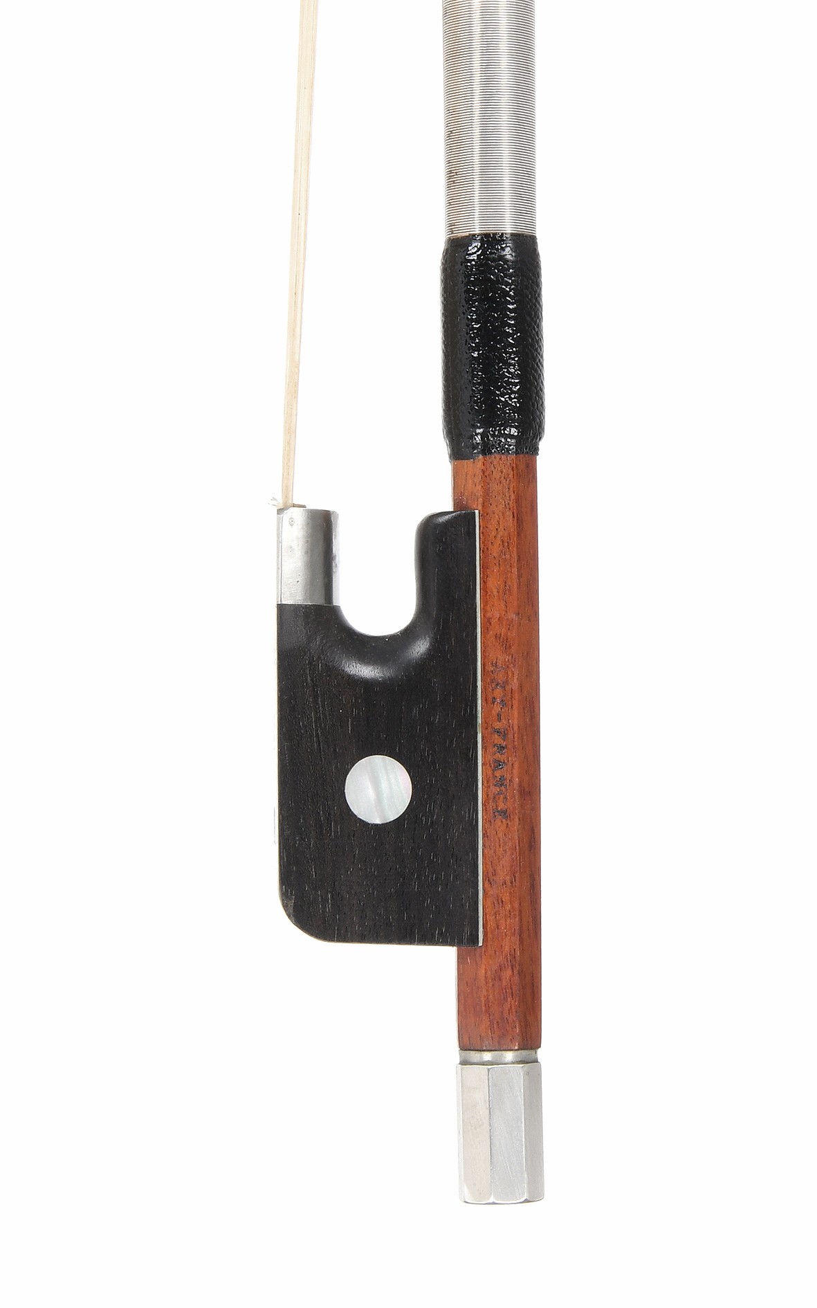 Archet de violoncelle 3/4 français de la maison Roger Gérôme. Cet archet de violoncelle 3/4 est un produit artisanal français de grande qualité, fabriqué vers 1970. Il est très recommandé pour son excellente sonorité et ses propriétés de jeu. La baguette, solide et ronde, est en bois tropical brun rouge. Elle est fabriquée à la main selon les meilleures techniques françaises. Sa tête est élégante, allongée et incurvée. La grenouille en ébène montée en maillechort est ornée de beaux yeux parisiens, d'un bouton de nacre blanc scintillant et d'une vis monobloc. L'archet de violoncelle 3/4 Roger Gérôme, parfaitement conservé, est parfaitement équilibré et son centre de gravité est légèrement situé dans la moitié inférieure. L'archet de violoncelle 3/4, parfaitement conservé, séduit par sa sonorité claire, chaude et rayonnante, typiquement française. Comme tous nos instruments à cordes et archets de violoncelle, il est livré sans frais de port, avec un droit de retour de 30 jours, une garantie de mise à niveau et de reprise et un certificat en option.