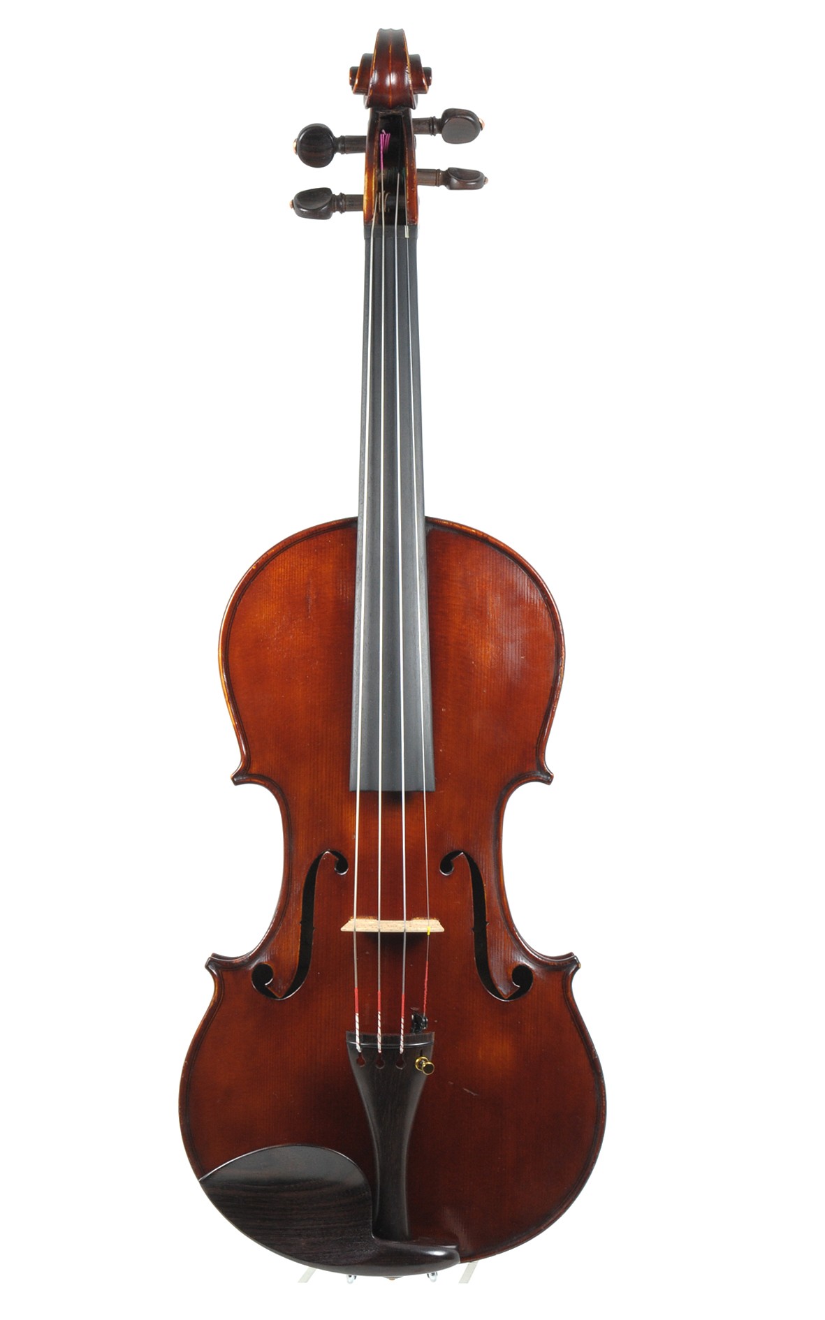 Im März des Jahres 1912 enstand im Londoner Atelier von James Steele diese zierliche Geige, deren hübsches, individuelles Modell von ihrem Erbauer die Bezeichnung „Quartus“ erhielt. Tiefroter Öllack bedeckt ausgesucht schöne Tonhölzer, deren Wahl sowohl reiche handwerkliche Erfahrung als auch erlesenen Geschmack demonstriert. Die leicht wolkige, asymmetrische Flammung des Ahorn-Bodens bestimmt den Charakter der Geige, den die selbstbewusst große, machtvolle Schnecke abrundet. Die Herkunft dieses unbeschädigten, perfekt erhaltenen Instruments belegt das datierte Original-Etikett im Inneren des Korpus. Nach einer gründlichen Aufarbeitung in unserer Fachwerkstatt bieten wir die Geige in sofort spielfertigem Zustand an und empfehlen ihren vorzüglichen, sehr reifen und klaren, solistischen Klang, der mit einer dunklen Note fließend und präzise, voll Resonanz und von ausgezeichnetem Volumen ist.