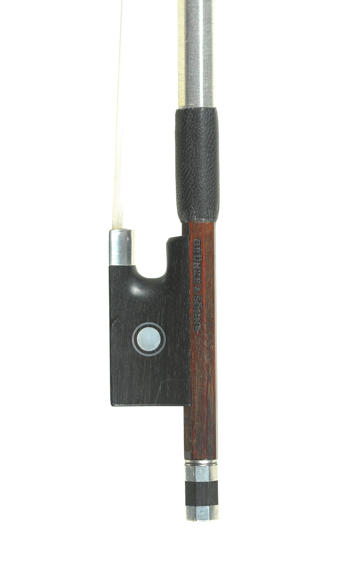 Ende des 20. Jahrhunderts ist dieser beste deutsche Geigenbogen des bekannten zeitgenössischen Bogenmachermeisters Richard Grünke in Bubenreuth entstanden. Richard Grünke begann seine Ausbildung zum Bogenbauer 1945 bei Edwin Hermann in Schönlind und beendete sie nach den Kriegsjahren in der angesehenen Werkstatt H. R. Pfretzschner in Markneukirchen, wo er von 1946 bis 1948 arbeitete. Der Geigenbogen mit Silber Kopfplatte trägt den Grünke & Söhne Stempel auf der Stange über dem Frosch. Die kräftige, runde Stange ist aus feinstem, braunem Fernambuk gearbeitet, der Frosch auf einer fein gearbeiteten Hill-Bahn ist Echtsilbermontiert mit Pariser Auge. Dieser emfehlenswerte Grünke Bogen eigent sich für das kraftvolle Spiel, liegt sehr gut ausbalanciert in der Hand, der gefühlte Schwerpunkt mittig, leicht in der oberen Hälfte. Das Gewicht ist 62,1 g, die Länge 74,3 cm. Der spielfertige Bogen mit besten Spieleigenschaften ist bei gutem Gewicht ein aktiver, kräftiger Bogen, er produziert einen grossen, klaren, tönenden Klang.