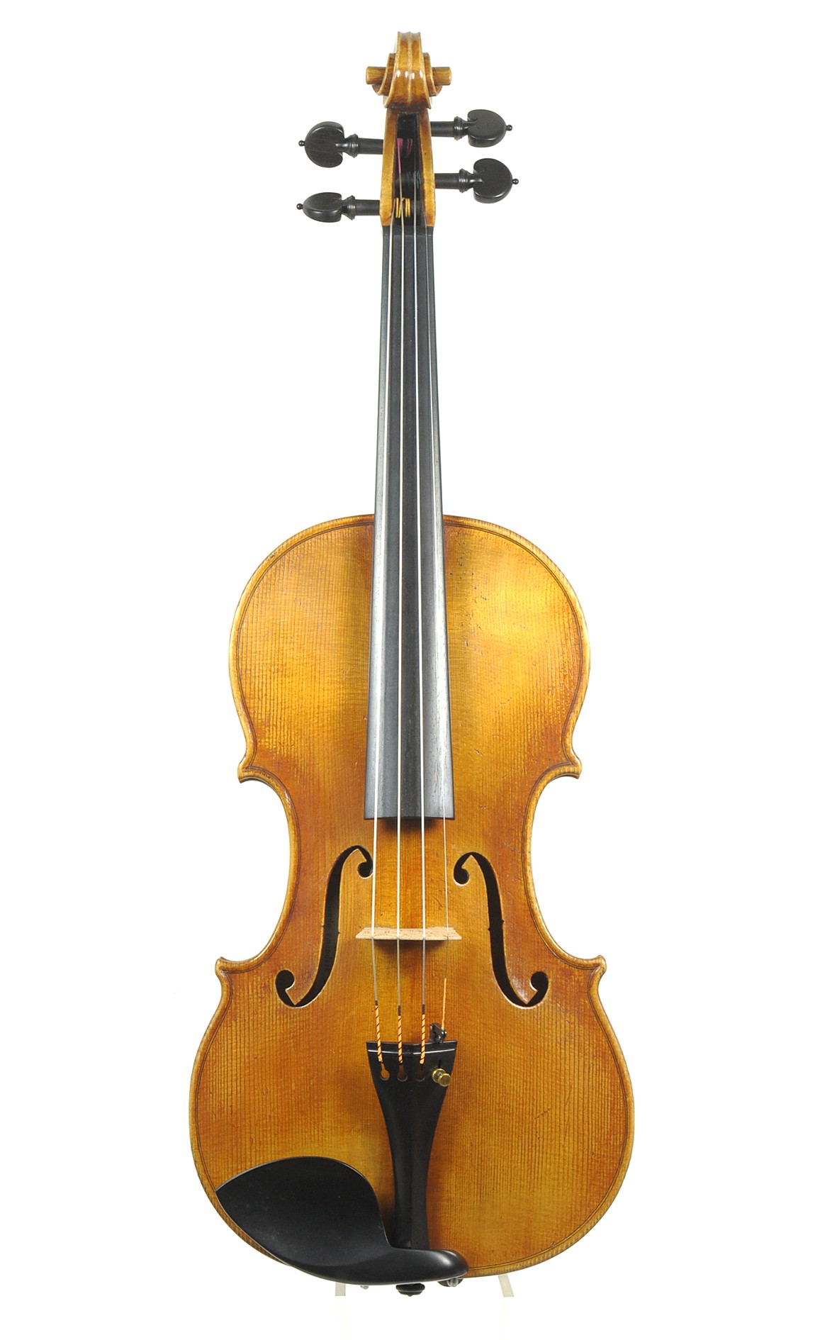 Ce nouveau maître violon est une œuvre récente du luthier de Rosenheim Bernd Ellinger, qui donne un échantillon très intéressant de son savoir-faire avec cette réplique de Guarneri, qui est un parfait exemple de son savoir-faire tant sur le plan sonore qu'esthétique. Dans sa beauté idiosyncrasique et son excellence technique, cette copie profonde du célèbre "Lord Wilton" est en même temps un hommage du jeune maître à ses professeurs Andreas Augustin et Christoph Götting, qui, aussi différents que soient leurs propres intérêts et approches en matière de lutherie, ont influencé l'œuvre de Bernd Ellinger dans une égale mesure et dans le cadre d'une coopération harmonieuse. Les fines antiquités, dont Ellinger ne se sert à aucun moment pour exagérer le caractère de l'instrument, semblent tout à fait naturelles - avec le vaste vocabulaire des techniques polyvalentes qu'Andreas Augustin a développées dans cette discipline et qu'il a transmises à son élève. La grâce du vernis sur le fond jaune très lumineux souligne le flammage exceptionnellement beau du fond en érable qui, conformément au modèle historique de la Guarneri "Lord Wilton", est exécuté d'un seul tenant et accentue le noble grain de l'épicéa de Mittenwald dont est faite la table d'harmonie, animé de jolies asymétries. Le couronnement en ébène du chevalet est une caractéristique frappante du grand soin et de l'attention aux détails qui caractérisent la méthode de travail d'Ellinger, et qui porte ses fruits décisifs dans les excellentes caractéristiques sonores de ce violon. C'est là qu'il trouve le chemin du légendaire son Guarneri grâce au modèle des violons de Christoph Göttingen, dont le système tonal - une somme de plus de deux décennies de travail sur les meilleurs instruments de l'histoire de la lutherie avec J. & A. Beare - a permis à Bernd Ellinger d'étudier pendant quatre ans comme collaborateur de Göttingen à Michelmersh et Wiesbaden. Avec le violon proposé ici, il a créé un instrument au son étonnamment mature - compte tenu de sa jeunesse - qui est merveilleusement équilibré sur toutes les cordes, avec une chaleur et une grandeur riches dans les registres inférieurs et une brillance douce et rayonnante dans les registres supérieurs.