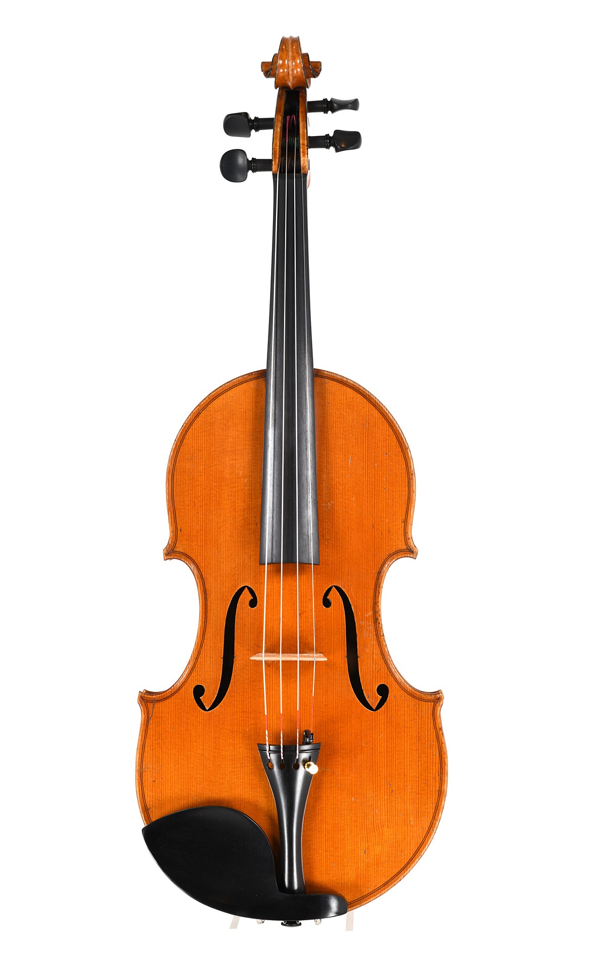 "Un luthier qui ne comprend pas l'acoustique des instruments à cordes n'est en fait qu'un menuisier". Aussi implacable qu'Antoine Marius Richelme (1832-1896) ait été à son avis, le luthier travaillant à Marseille était aussi hors du temps et extraordinaire dans son art. Avec ses études de géométrie, il s'inscrit dans la tradition de François Chanot (1788-1825) et de Félix Savart (1791-1841), tous deux incapables de s'affirmer avec leurs instruments à sensation, mais qui influencent néanmoins le développement de la lutherie moderne, dans le cas de Savart par exemple à travers sa collaboration avec J. B. Vuillaume. Marius Antoine Richelme n'est pas non plus devenu le point de départ d'une nouvelle école, mais il a laissé derrière lui des instruments à cordes d'excellente qualité, qui, fait intéressant, se rapprochent à nouveau de l'ancien type de viole de gambe. Le violon Marius Richelme n° 23 proposé ici est un exemple typique de son œuvre, dont la caractéristique la plus frappante est la forme particulière des archets supérieurs et inférieurs. Richelme n'est pas seulement un artisan expérimental mais aussi un artisan solidement formé. Son choix de bois de tonnerre de première classe, que le dos en érable étroitement flammé représente avec une beauté saisissante, prouve qu'il est un artisan hautement qualifié. Le parchemin est très finement travaillé, un caractère qui est complété par les bords noircis. Cependant, tout l'art du luthier Marius Richelme était au service de l'acoustique. En effet, le son exceptionnellement beau, chaud et mature du violon est la meilleure référence pour son modèle, qui est précis, résonnant et parfaitement équilibré entre les cordes. Nous proposons cet instrument spécial en excellent état, vérifié et reconditionné par notre luthier et prêt à jouer immédiatement.
