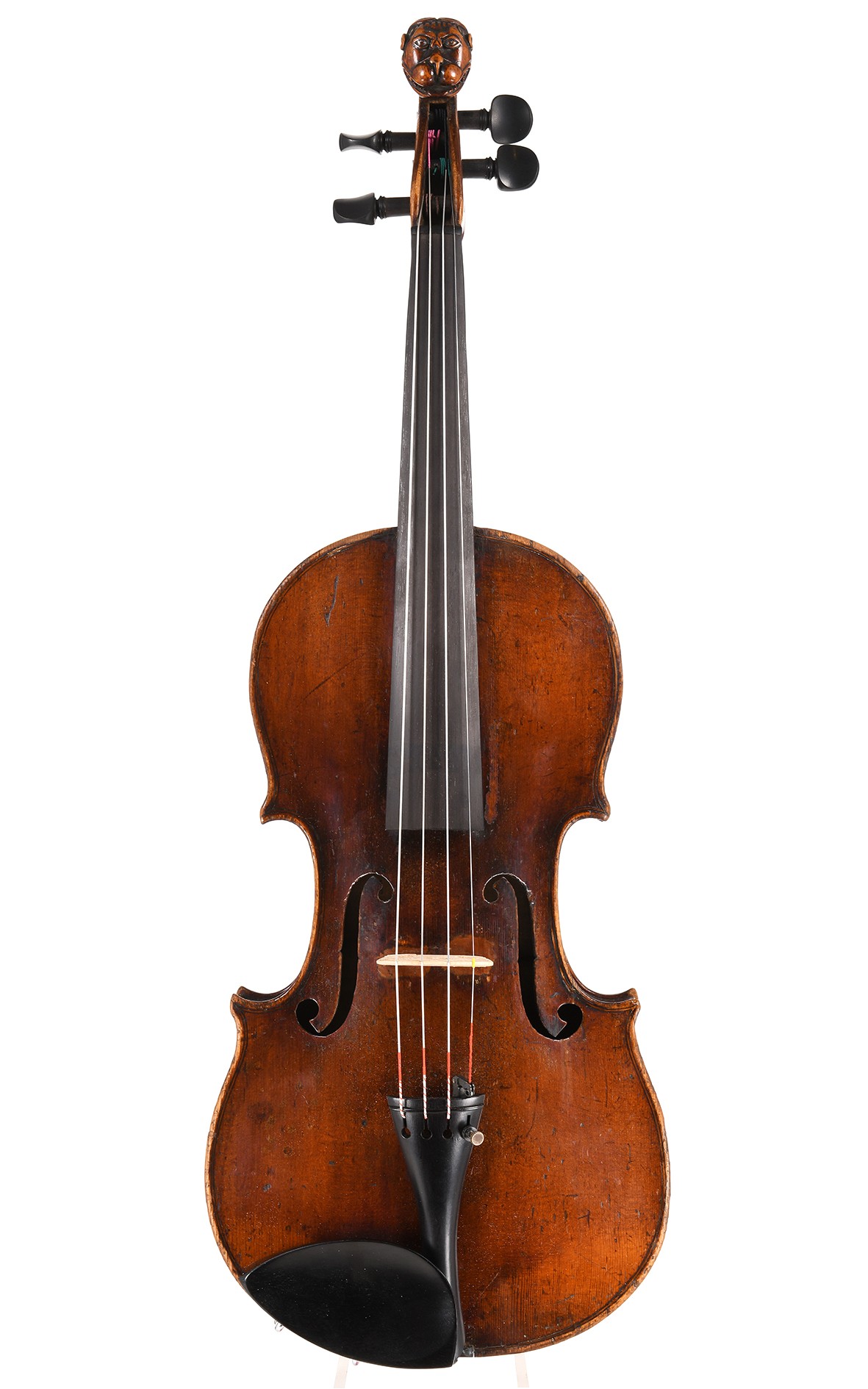 Une tête de lion expressive et finement travaillée orne cet ancien violon français estampillé "A la ville de Crémone", probablement construit vers 1830 dans l'atelier de Didier Nicolas l'Aine, et qui fait partie des exemples les plus rares de ces instruments particulièrement décorés. Sa belle tête de lion est un travail de sculpture traditionnel bien réussi de tradition française, qui révèle...