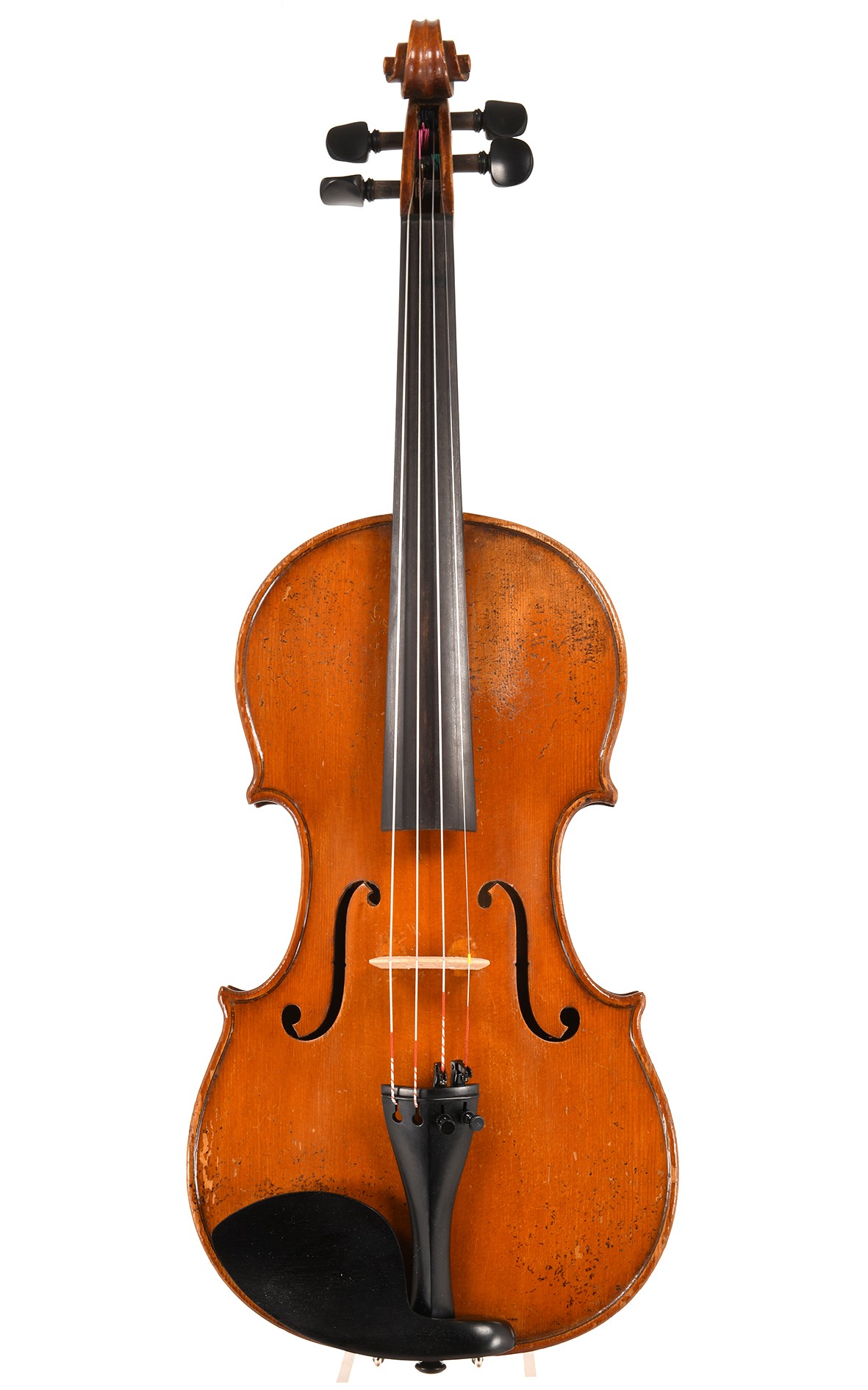 Violon français ancien, vers 1880, atelier Caussin. Une étiquette apposée ultérieurement n'a aucune importance. François Caussin (1794-1866) était un luthier français talentueux formé à Mirecourt qui maîtrisait l'art du vieillissement avec une grande virtuosité. Ce violon Caussin a été fabriqué vers 1880 dans l'atelier familial, alors dirigé par ses fils François-Hippolyte et Nicolas Caussin, d'après un modèle de Michele Deconet. François-Hippolyte et Nicolas Caussin s'affirment ainsi comme les dignes successeurs de leur père et maître : outre son aspect caractéristique, ce violon en excellent état séduit par sa sonorité exceptionnelle, brillante, riche en harmoniques, mûre et puissante.