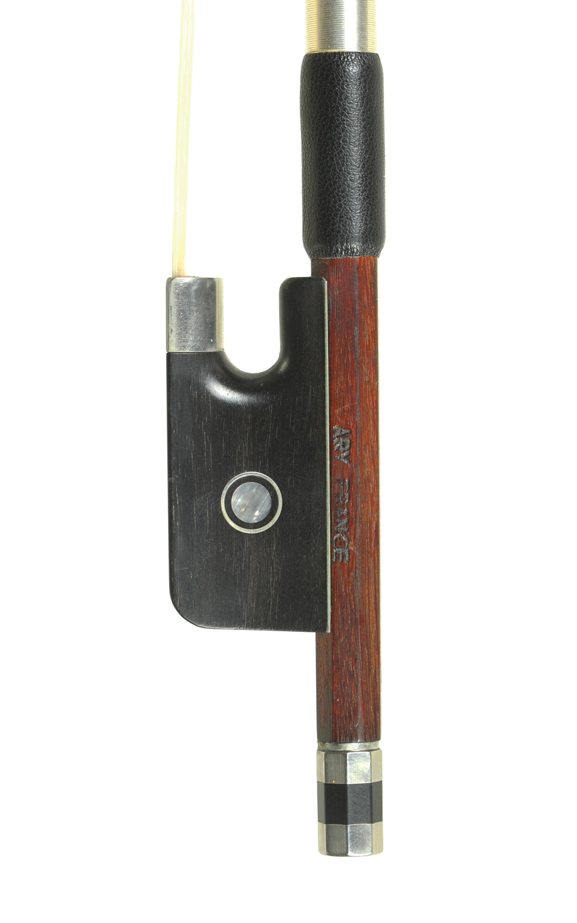 French 3/4 cello bow crafted by Roger Gérôme. This highly recommended 3/4 cello bow is a fine old French piece of craftsmanship of excellent sound and playing quality, built around 1970. The strong, round stick made of reddish-brown tropical wood was made by the finest French craftsmanship, with a tastefully elongated, curved head. The nickel-mounted ebony frog is adorned with beautiful Parisian eyes, a shimmering white mother-of-pearl slide and a one-piece screw. The perfectly preserved Roger Gérôme 3/4 cello bow is well balanced and has its center of gravity in the lower half. The 3/4 cello bow has been preserved in pristine condition and impresses with its bright, warm, radiant French sound. Like all our cello instruments and cello bows, it comes with free shipping, a 30-day money-back guarantee, an upgrade and trade-in guarantee, and an optional certificate.