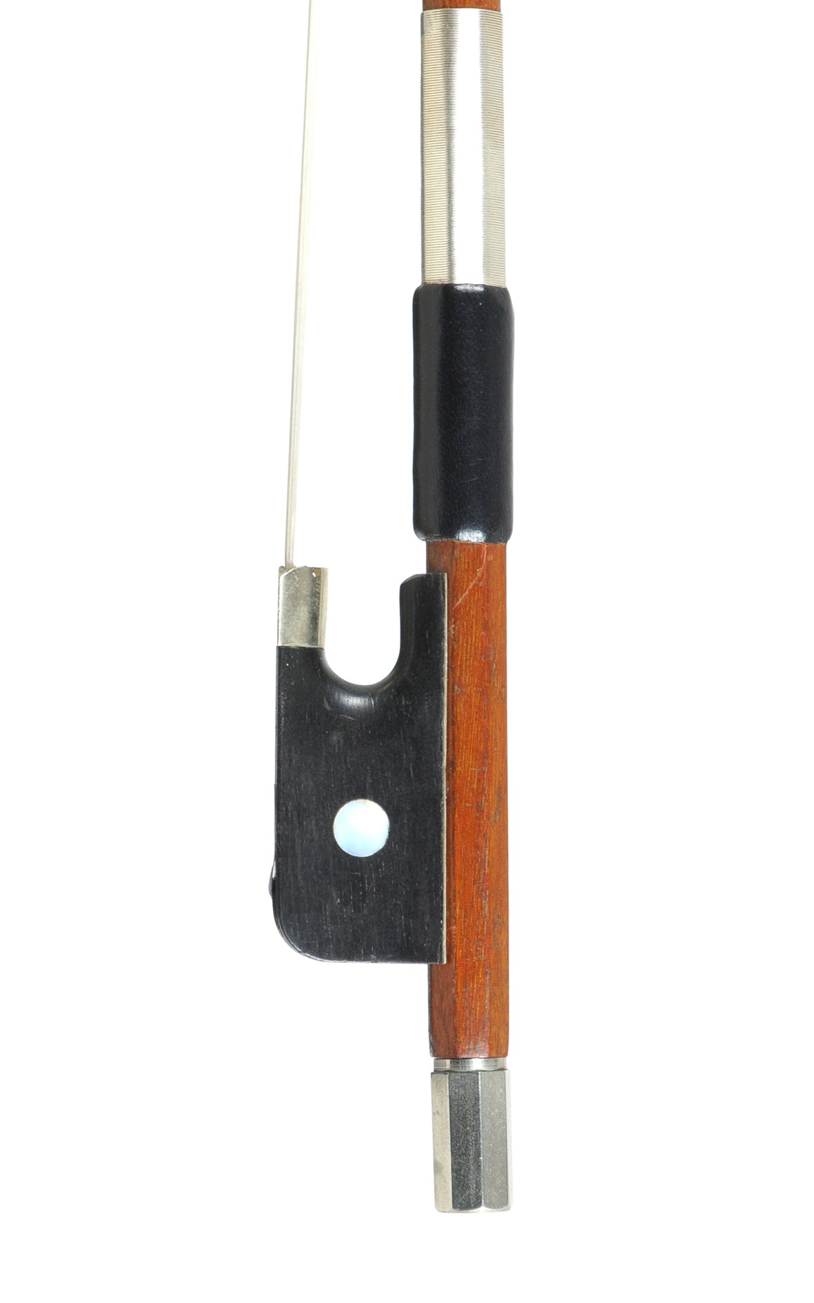 French 3/4 cello bow, a typical handade quality piece from Mirecourt, built approx. 1980. The round stick of light brown Massaranduba wood is well-balanced and of good strength, with very well distributed diameter which clearly is the work of an experienced craftsman. The ebony frog is nickel mounted and decorated by a mother-of-pearl eye and a white shimmering mother-of-pearl-slide. The felt...