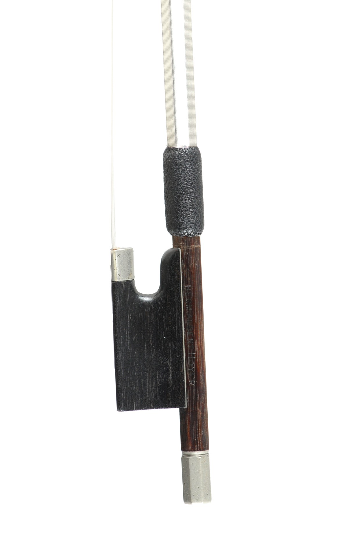 A fine German violin bow by Hermann Albert Hoyer. The bow was made in Markneukirchen around 1930. The bow is stamped Herm. Albert Hoyer on shaft and a logo the frog, the stamps are original. The octagonal stick is made of dark brown pern-ambuco wood. The plain ebony frog is nickel mounted with nickel slide and adjuster. The metal parts of the frog and the adjuster have floral engravings. The soft stick has its balance point in the lower third part of the stick. The bow is agile and plays actively. The bow is producing a bright and clear tone.