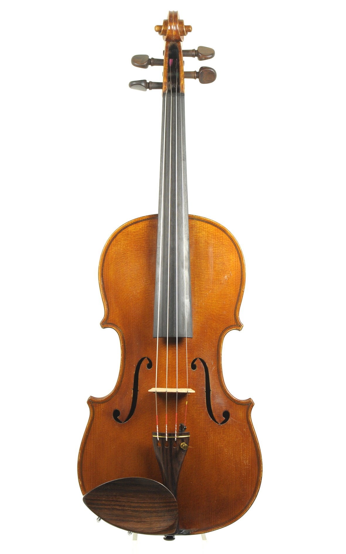 This rare US-American violin by Lincoln Clough, which was crafted in 1925, conveys a profound knowledge of the Italian violin-making tradition. It is an impressive manifestation of the artistic canon created by historic 17th century masters such as the widely copied Antonio Stradivari, an oeuvre which transcended national borders. As an excellent luthier who produced this melodious instrument Lincoln Clough paid tribute to far more than merely the aesthetic of the classical models: when crafting of the body, he continued to honour the principles which define the exceptional nature of Italian stringed instruments. He demonstrated self-assured experience in his selection of US American tone woods for this broad but flat-arched model. The unmistakably Italian and unique character of this instrument comes from both the moderate to widely grained spruce of the top as well as the back and ribs of maple with most beautiful flames. The charming patina of the transparent golden-brown oil varnish are highlights of an instrument which was well played and thoroughly appreciated for almost 100 years. Maintained in excellent condition and entirely free of cracks, this interesting American violin has now been completely set up by the restoration specialists at our atelier, and its sound was professionally adjusted to acoustic perfection. Its warm, large, melting tone with a singing quality in the upper registers offers delightful interpretative opportunities to sophisticated musicians.