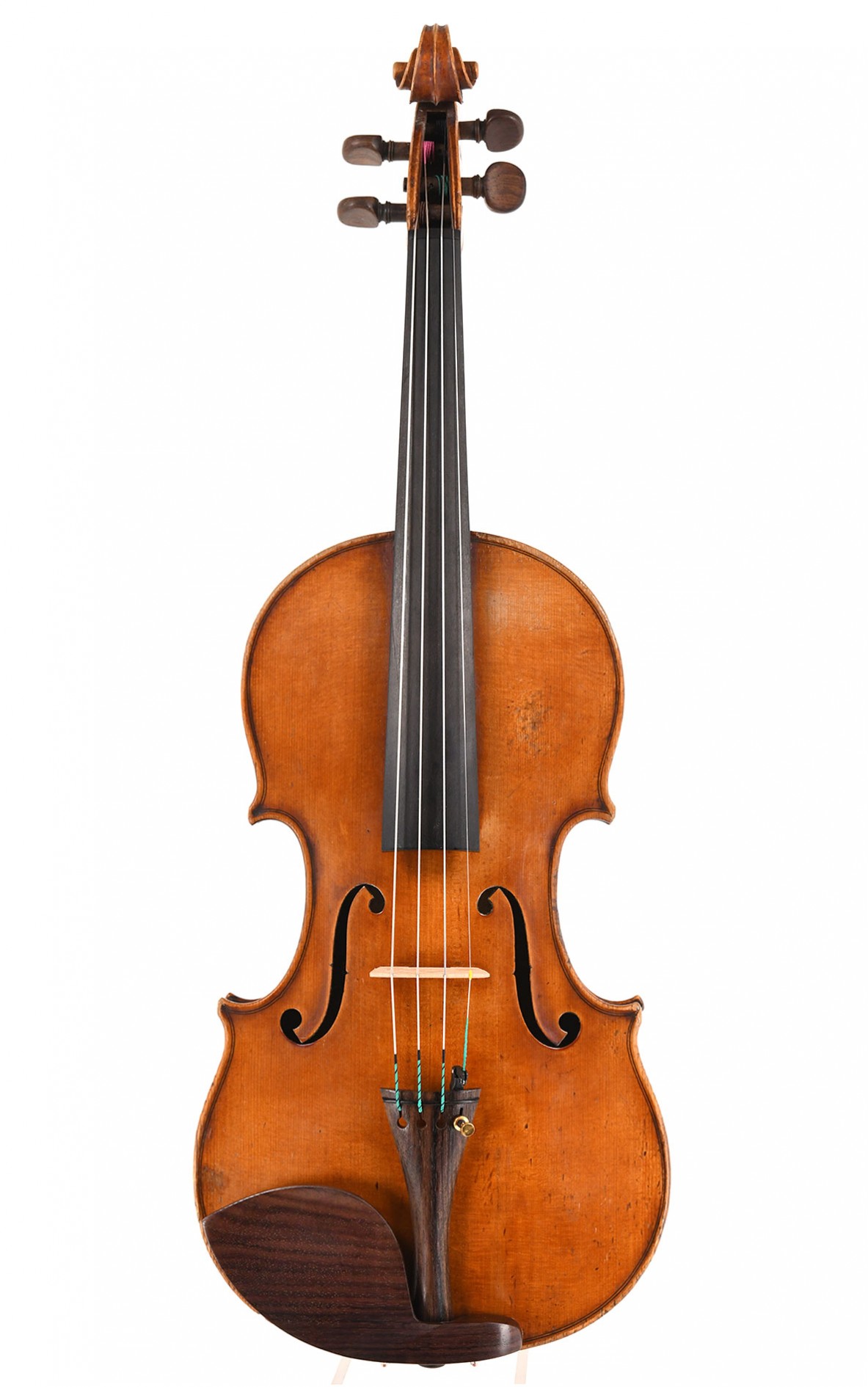 Emile Mennesson (1842-1920)'s tasteful appearance of this violin and its excellent sound reveal his intense involvement with the Mirecourt violin making tradition, especially with the legacy of Honoré Derazey, which he had come to know not least through his later partner Georges Deroux - a Derazey student and influential teacher for many talented Mirecourt violin makers of the time. The son of a well-established family of music dealers and piano makers in Reims, Mennesson had his own artistic home in violin making and ran his workshop comparatively free of economic constraints. The high aesthetic and musical standards he followed are reflected in the high-quality tonewoods of the violin offered here, which were crafted with the utmost care. The one-piece back of beautiful, tightly and powerfully flamed maple is a consummate detail typical of Mennesson's best work. For it, he exclusively used the dated and numbered original label that can be found inside the body. Thanks to its very good condition, this authentic Emil Mennesson violin presents itself in excellent condition. Its golden brown varnish has developed beautiful patina over time, which, as well as a top repair and minimal additions to the scroll, are common for an instrument of this great age. In its impeccable top condition, which our luthiers have convinced themselves of during a thorough inspection, the violin possesses all the beauty of its large, radiant sound, which opens up wide musical action spaces for demanding violinists.