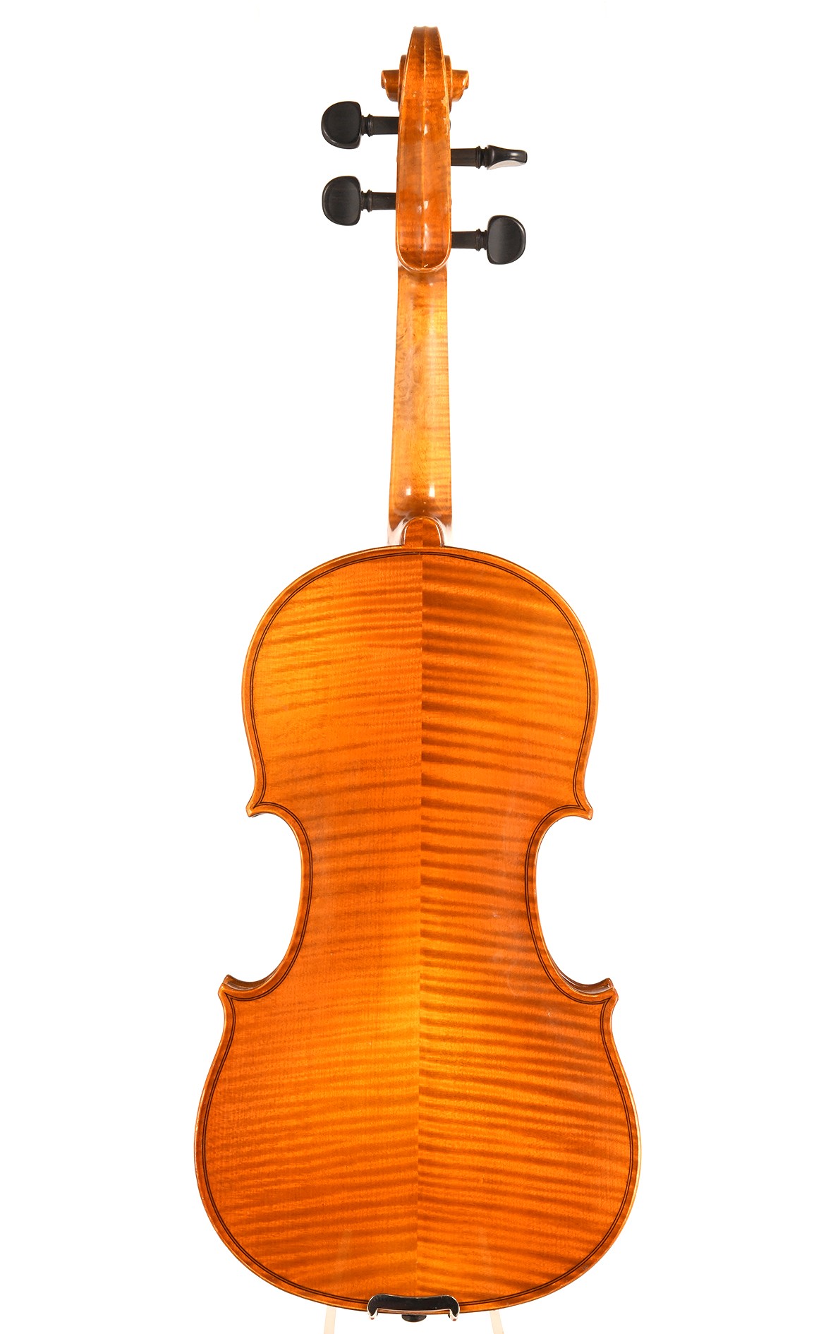 German violin by Ernst Maurer made in 1991 in the Franconian town of Bubenreuth. This violin is a good and well-built instrument. It is sturdy and designed to meet straightforward standards for everyday use. At the same time it is surprising with its exceptionally finely crafted purfling that extends well into the corners. The instrument was patterned after a popular and tried-and-true Stradivari model and has an orange-brown varnish and a top made of good moderately-grained spruce. This good sounding Bubenreuth violin has some traces of use and a small uncritical repair and we offer it in ready-to-play condition. Its sound is very well suited to orchestral playing and has a bright, clear character that is of good strength and rich in overtones. Price is around 50% discounted towards a comparable new instrument.