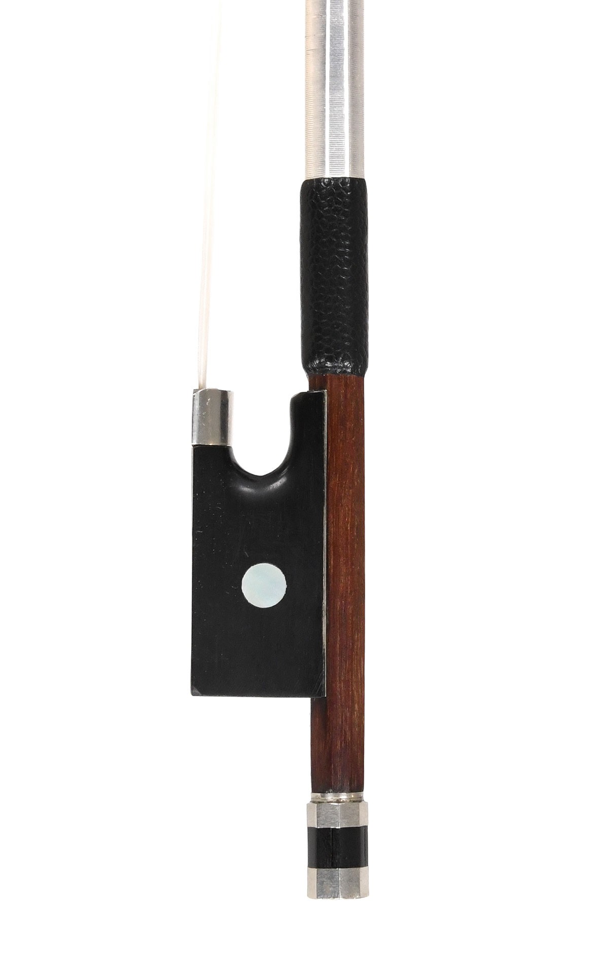 Französischer Geigenbogen gebaut für Rene Bailly von Laberte in Mirecourt. Dieser französische Geigenbogen guter Qualität aus Fernambukholz trägt den Stempel Rene Bailly entstand um das Jahr 1950. Dieser Geigenbogen ist ein typisches Beispiel für französische Geigenbögen handwerklicher Meisterqualität in der Zeit ihrer größten Erfolge. Die runde Stange ist mittelstark, spielt sich mittelstark und von Elastizität, ihr gefühlter Schwerpunkt liegt mittig, leicht in der oberen Häfte, gemessen bei 26,0 cm der Gesamtlänge von 74,5 cm. Werte, die einen hervorragenden französischen Geigenbogen mit all jenen guten Spieleigenschaften beschreiben, für die der französische Bogenbau berühmt ist. Mit einem Perlmutt Auge und einem fein schimmernden Perlmuttschub ist dieser französische neusilbermontierte Geigenbogen ebenso schlicht wie elegant ausgestattet. Als ein Werk aus einer erfahrenen Hand erweist er sich dieser feine, spielfertige französische Geigenbogen nicht zuletzt durch seinen hellen, französischen, warmen und goldenen Ton. Versandkostenfrei, mit 30 Tage Rückgaberecht, Inzahlungnahme-Garantie und Zertifikat optional.