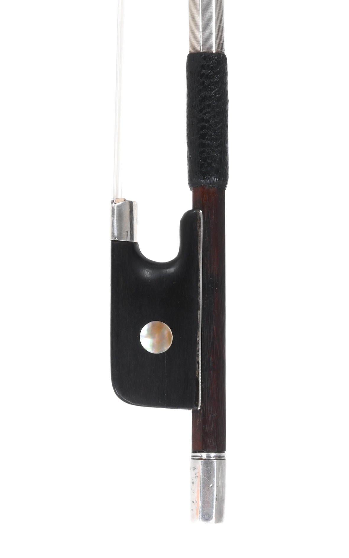 Arco da violino inglese di pregevole fattura e dal suono nobile e dolce. L'arco per violino è stato probabilmente realizzato in Inghilterra alla fine del XIX secolo da un maestro artigiano sconosciuto. La bacchetta rotonda in pernambuco è della migliore qualità - altamente elastica, con una buona tensione e si presenta in un meraviglioso colore marrone chiaro-oro. L'elegante testa di questo arco, inconfondibilmente inglese, il frog montato in argento con piccole imperfezioni e la gamba in argento in un unico pezzo sono finemente lavorati. La lunghezza complessiva dell'arco da violino, perfettamente bilanciato e comodo da suonare, è di 74,2 cm, il baricentro misurato è a 26,5 cm dall'estremità del frog. Il centro di gravità percepito si trova al centro, leggermente nella metà superiore. Questo raffinato arco da violino inglese produce un suono colto, caldo, brillante, nobile, risonante e dolce.
