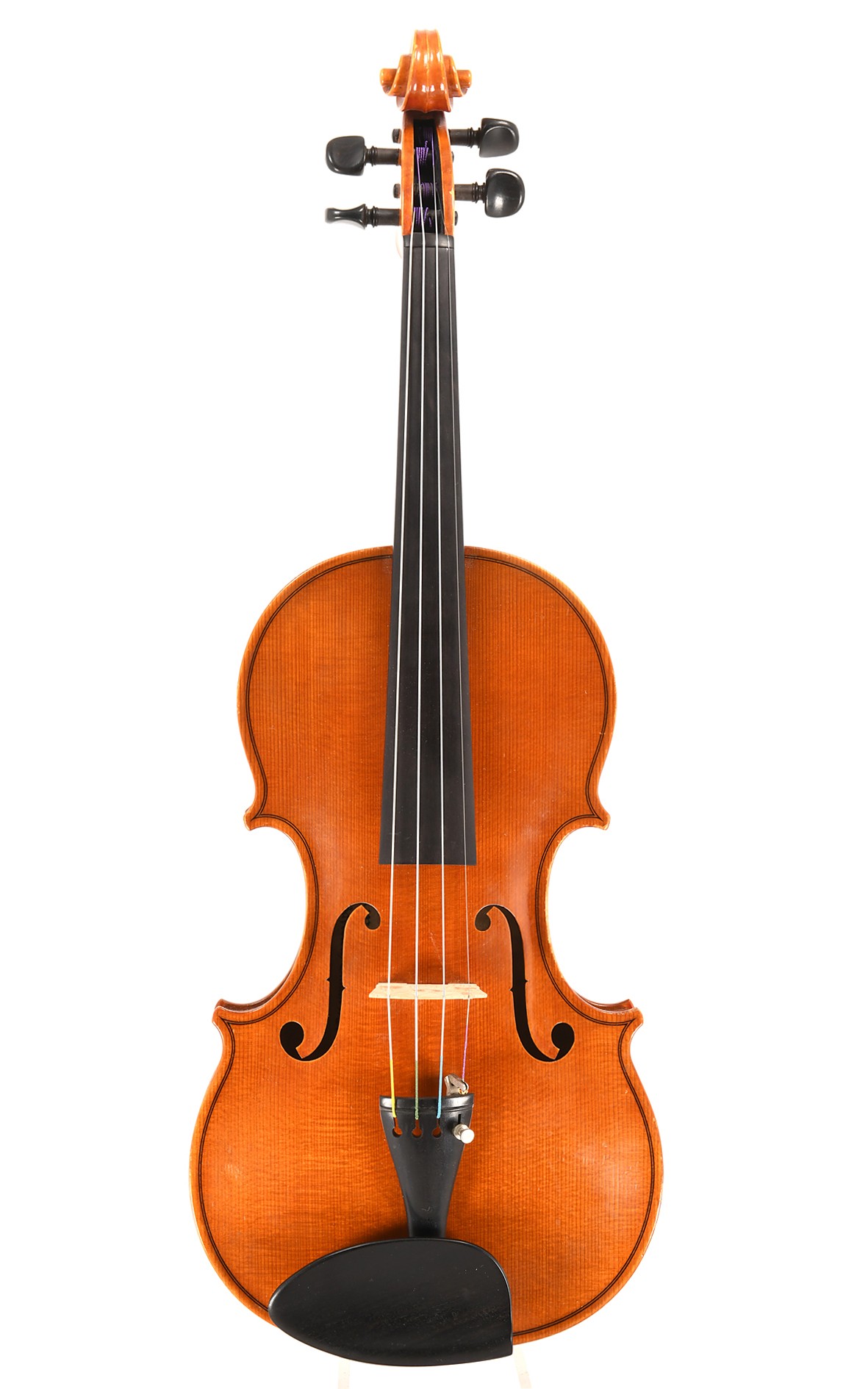 Eine musikalische und ästhetische Entdeckung ist diese seltene Violine des vor wenigen Jahren verstorbenen Geigenbauers Leodegar Mayr, die mit ihrer ausgesprochen hübschen Erscheinung, ihren höchst angenehmen Spieleigenschaften und ihrem exzellenten Klang auf ein interessantes und umfangreiches Lebenswerk aufmerksam macht. Mayr lernte an der Mittenwalder Geigenbauschule und verfeinerte seine Fähigkeiten in einer dreijährigen Mitarbeit bei Johann Karl Padewet in Karlsruhe, der seinerseits bei Giuseppe Fiorini und Georg Winterling zu einem Repräsentanten bester Handwerkstradition gereift war. Als 1981 entstandenes Instrument stellt die hier angebotene Geige Leo Mayrs Kunst auf dem Höhepunkt seiner Laufbahn vor. Ihre kreative und individuelle Ausarbeitung reflektiert die reiche Erfahrung, die Mayr nicht allein in seinen eigenen Neubauprojekten, sondern auch durch die Zusammenarbeit mit den Berliner und Wiener Philharmonikern sowie im Kontakt mit führenden Solisten wie Julia Fischer, David Garrett und Gidon Kremer gesammelt hatte. Der tief geflammte, zweiteilige Ahornboden, die harmonische Maserung der Fichtendecke und das edle, goldbraune Lackbild lassen die herausragende Qualität dieses Instruments auf den ersten Blick erkennen, das unsere Geigenbauwerkstatt mit größter Sorgfalt aufgearbeitet und spielfertig hergerichtet hat. Obertonreich und strahlend im Klang entwickelt diese unbeschädigte Leo Mayr Geige ein unverkennbares musikalisches Profil, dessen heller, klarer und süßer Charakter interessante Optionen für die Interpretation hochrangiger Werke aller Epochen eröffnet.