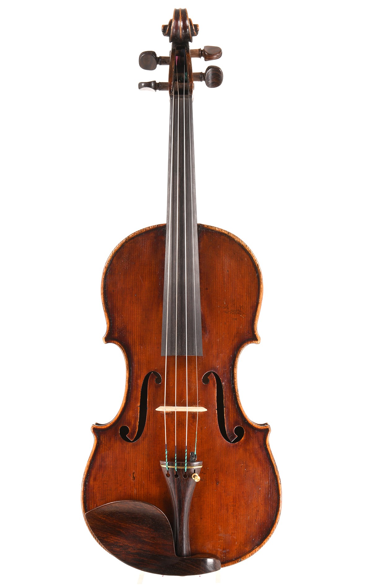 Questo bel violino inglese appartiene probabilmente all'opera di George Chanot, che ha condotto una vita un po' riottosa prima di stabilirsi per diventare uno dei più grandi maestri della liuteria inglese del XIX secolo. L'innovazione e l'eccellenza artigianale definivano la tradizione della famiglia Chanot, che aveva le sue origini a Mirecourt e che gestiva il laboratorio dove niente meno che un luminare del grande Jean-Baptiste Vuillaume mosse i primi passi della sua carriera. Non è stata quindi una vera sorpresa scoprire un numero d'inventario della famosa bottega londinese W. E. Hill & Sons impresso sulla scatola dei chiodini di questo violino e sulla tastiera (che abbiamo sostituito); questi segni confermano le virtù del violino come uno strumento della migliore provenienza e della massima qualità, sia per le sue proprietà musicali che per i suoi dettagli artigianali. La venatura da moderata a larga della tavola di abete rosso e l'acero strettamente fiammato del fondo monoblocco spiegano le eccezionali proprietà di risonanza, e l'ampiezza della bellezza di questi legni è accentuata dallo spesso strato di vernice ad olio rosso scuro con il suo intenso crepitio antico. Un cartiglio annerito completa il carattere enigmatico e attraente di questo violino George Chanot inimitabilmente distinto; il violino è arrivato a noi in perfette condizioni senza crepe e ora è stato completamente impostato e reso pronto a suonare dai restauratori professionisti del nostro laboratorio. Con la sua voce grande e potente, presenta un suono caldamente raccomandato con una precisione ideale per i solisti, pieno di calore maturo e una luminosità sorprendente che si estende fino ai registri superiori.