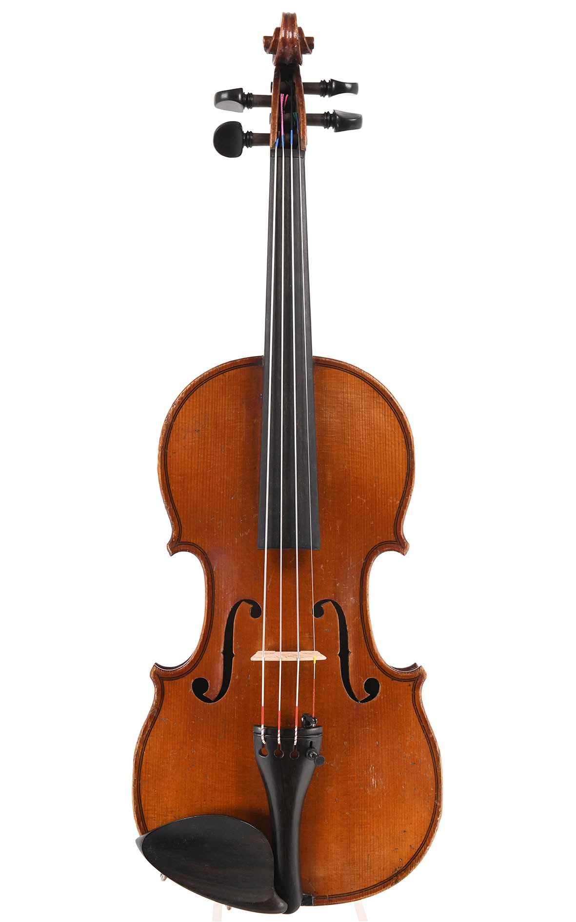 Französische 1/4 Geige, die um das Jahr 1900 gefertigt wurde, wahrscheinlich in der berühmten Geigenbaustadt Mirecourt. Es ist eines der seltenen, am Modell Stradivaris orientierten 1/4 Geigen in hochwertiger Qualität, von denen gleichwohl nur wenige Geigen vergleichbarer Qualität erhalten sind, insbesondere in dieser Größe. In außergewöhnlich gutem Zustand lässt die rissfreie 1/4 Geige ihr Alter nur durch Spielspuren und Retuschen erkennen und gewinnt ihre edle, antike Erscheinung durch die reizvolle Patina, die der orangebraun leuchtende Lack entwickelt hat. Ausdrucksstark wirken die charaktervolle Schnecke, die kleinen F-Löcher und der wunderschön tief geflammte Ahornboden und die Zargen. Von unserem Geigenbauer gründlich durchgesehen bieten wir diese besondere 1/4 Violine zu einem besonders günstigen Preis an in sofort spielfertigem Zustand an und empfehlen ihren charaktervollen, hellen Klang, der eine angenehm weiche Note enthält.