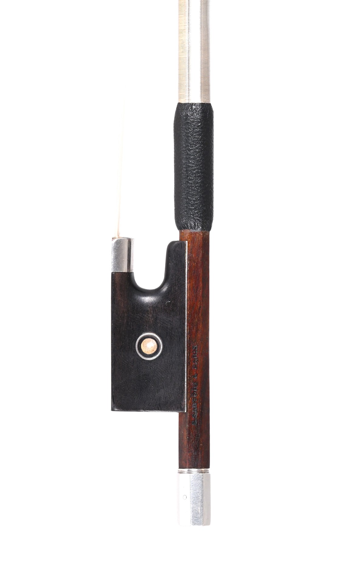 Fine violin bow by Eugène Sartory, Paris manifestly a typical Eugène Nicolas Sartory and a modern classic in bow making. Crafted in approximately 1895, this fine Sartory violin bow evolved during the most refined period of his oeuvre, and the choice of wood and the medium character of the stick give a preview of the later phase of his work, which research places in the early 1930s. At that time, as a world-famous master, Eugène Sartory could look back on a successful career of over thirty years in which he focussed on developing his own personal bow model whilst also writing bow-making history with minor yet significant innovations, earning himself a wide-ranging clientele amongst outstanding musicians. On certificates he issued in the 1920s, Eugène Nicolas Sartory referred with justified pride to the long series of awards he had won in major metropolitan cities across Europe ever since he began competing. The top-tier classic fittings of this violin bow solidify its place in the oeuvre of its master, who had also made other magnificent bows prior to this, pieces featuring gold fittings and intricate tortoiseshell, ivory and mother-of-pearl inlays. With an aesthetic that is subtle yet sophisticated and tasteful, the silver-mounted ebony frog with a Pearl eye and a three-part adjuster indicates that Eugene Sartory’s true epoch-defining achievement is primarily expressed in the music this violin bow produces – in its unparalleled characteristics and the exquisite sound which allows the bow to hold its own amongst the finest representatives of the French art of making bows. The pernambuco stick, with a round stick of medium strength made of the finest light-brown pernambuco, bears Sartory’s original brand mark "E. SARTORY PARIS" over the frog. We are selling this orignal Eugene Sartory violin bow with a certificate of authenticity by Jean-François Raffin of Paris; the certificate can be seen be clicking the appropriate button.