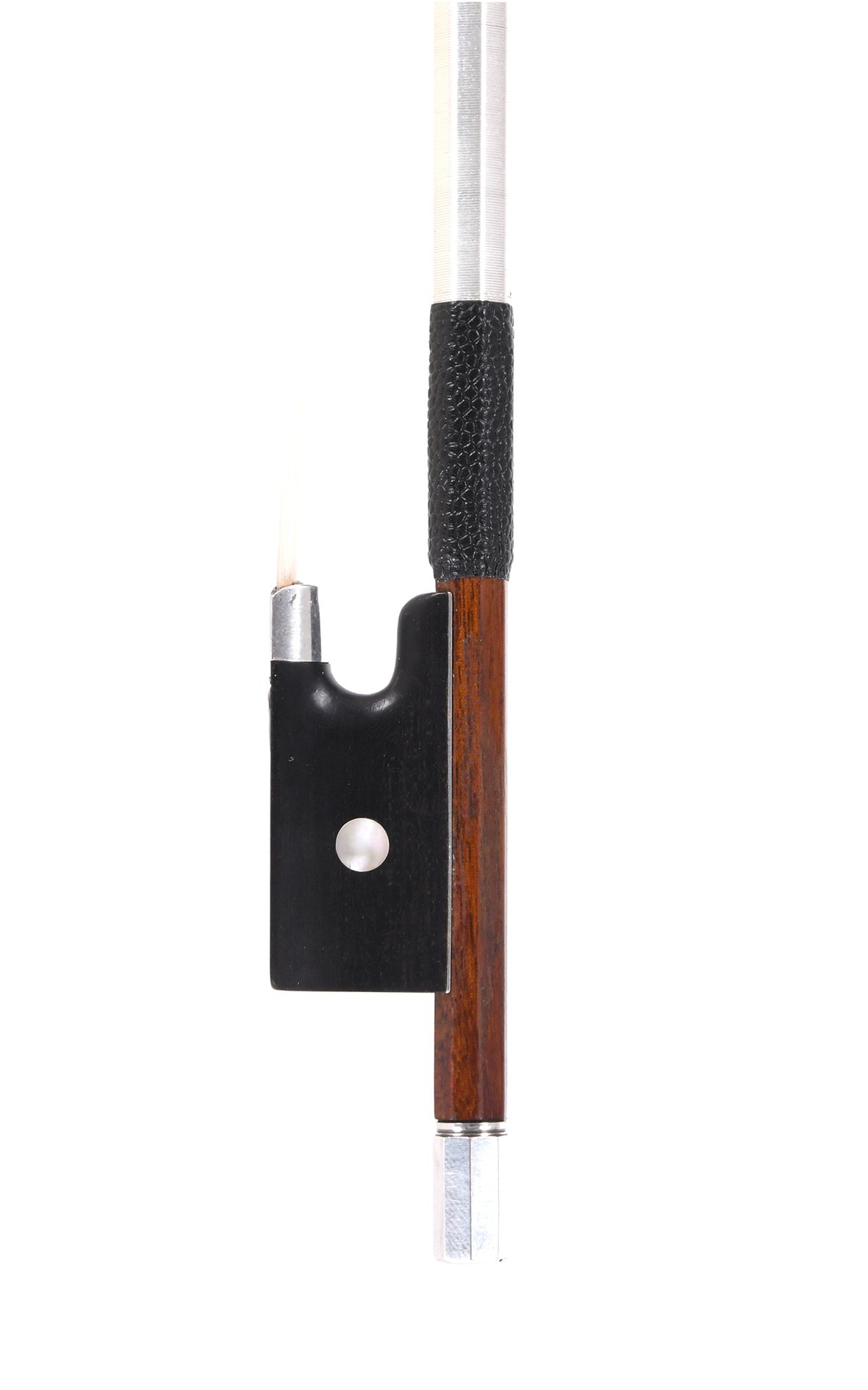 Franz Winkler learned the artisanry of bow making from his father in Markneukirchen. Soon Franz Winkler started to work autonomous and went to the United States, where he gained a lot of experience. At the beginning of the 20th Century he returned to Markneukirchen, where he died in 1962. Franz Winklers works are influenced by several French masters, but his own "Markneukirchen style" is clearly visible throughout. This Franz Winkler bow with an octagonal stick was crafted in the 1950's of medium strong pernambuco wood that features surprisingly high elasticity. The neatly finished ebony frog is silver mounted and decorated with a Pearl eye. Franz Winklers reputation for perfectly balanced bows speaks in this specimen, that was worked over completely by our luthiers and is offered ready to play. The balance-point is well-centered: he measured balance-point of the 74.5 cm long bow is at 25.4 cm from the frog end. The sound produced is warm, clear, large - this bow adds volume to the tone.