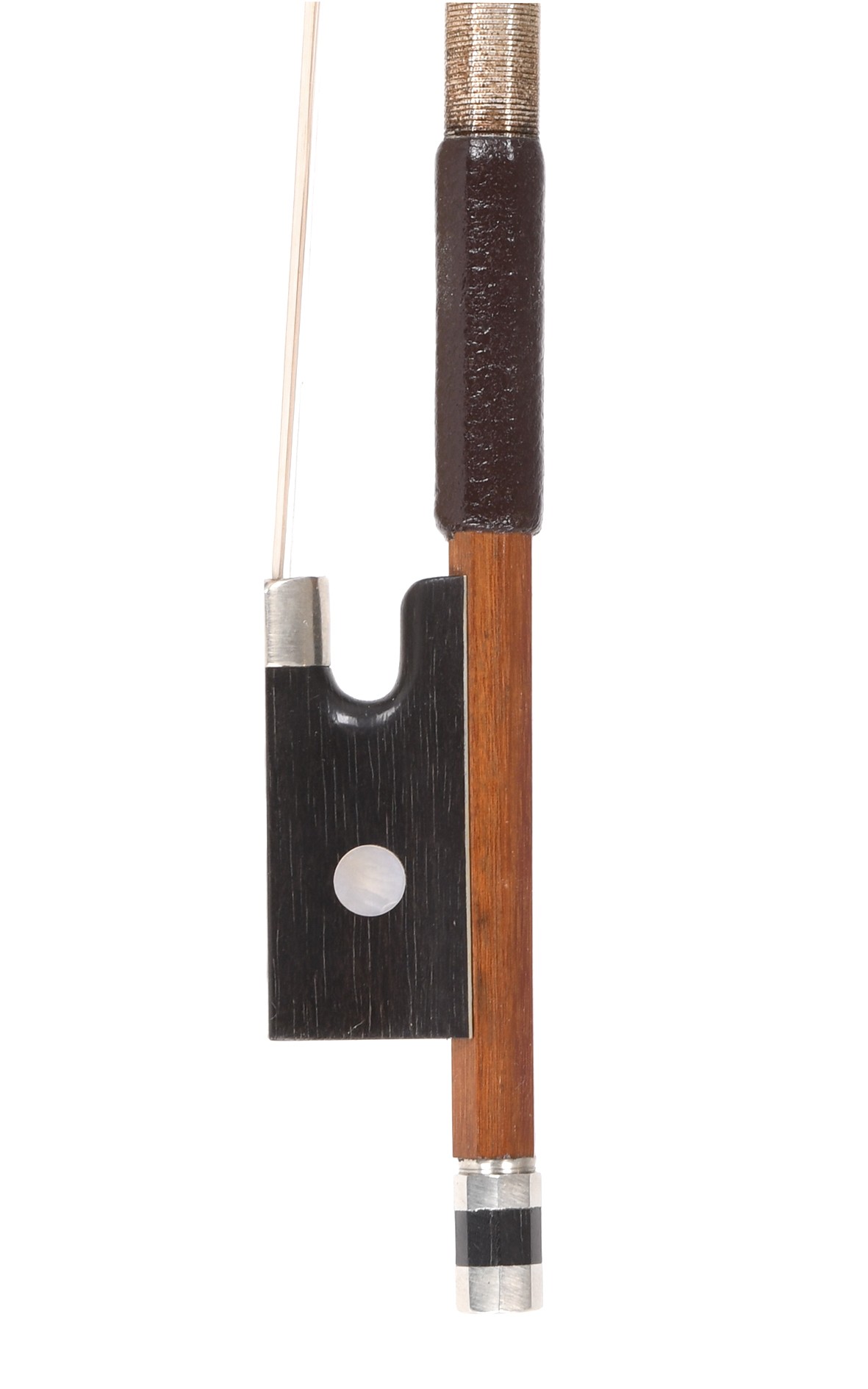 Outstanding German violin bow with powerful, elastic playing characteristics and a bright, radiant, full sound. This violin bow with Kuenzel Brandstemepl is a beautiful and powerful piece of craftsmanship with excellent playing characteristics, made around 1980. The strong stick with forgiving elasticity was made with a round cross-section from pernambuco and is equipped with high-quality...