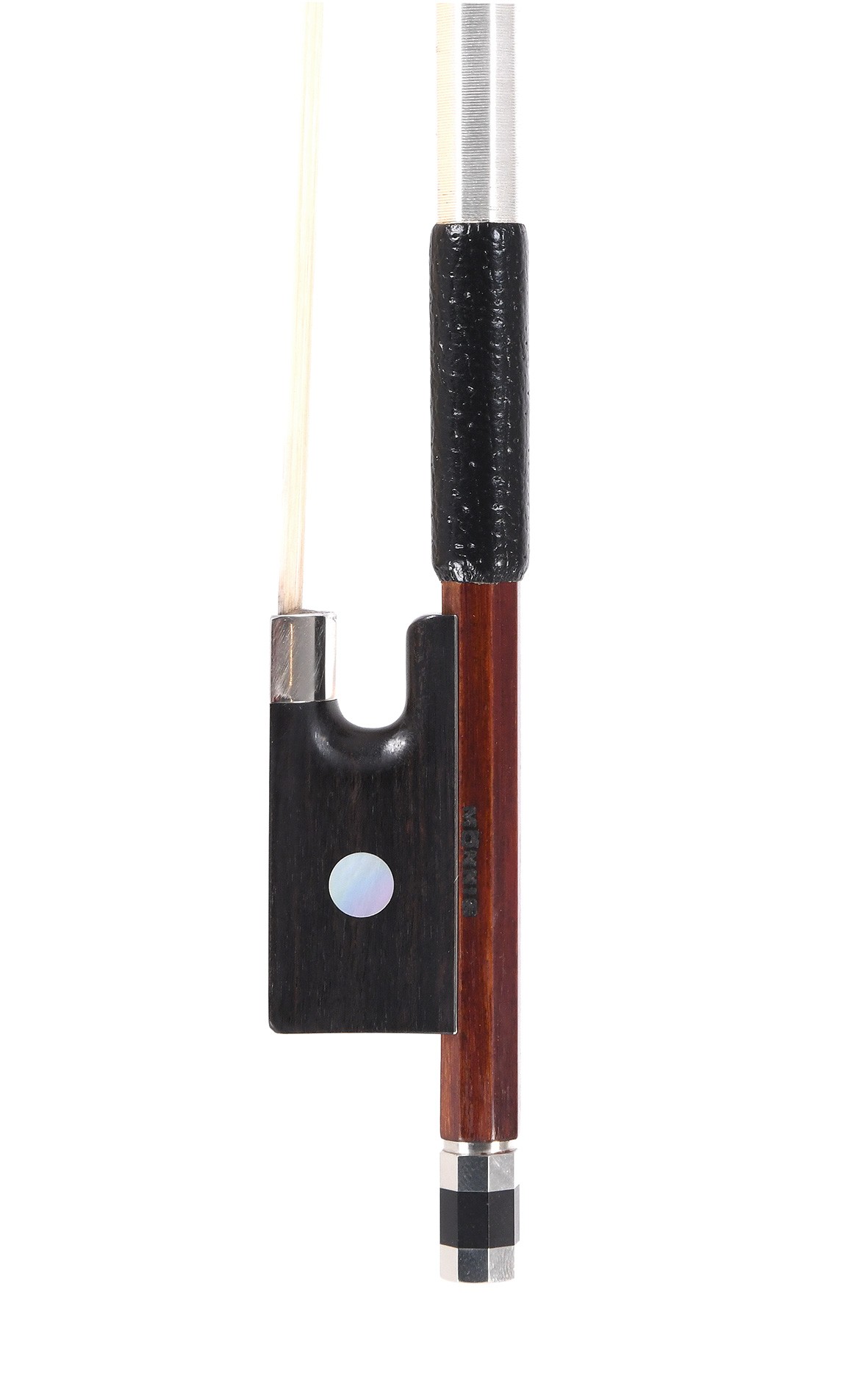This good German violin bow is a high-quality contemporary piece which was created at Michael Mönnig’s workshop, one of the last family-run businesses still operating in the great bow-making tradition of Markneukirchen. Michael and his son Thomas can trace the history of their family’s work back to their forefather Gottfried Herrmann Mönnig in the 18th century, and their dynamic tradition is clearly demonstrated by this violin bow which can be used for every occasion. The octagonal brown pernambuco stick featuring Mönnig‘s original stamp makes clear at a glance that hand-selected materials of the finest quality were chosen for this nickel-silver mounted bow. With its lovely carefully crafted head, its three-piece slide and an ebony frog with a simple eye, the violin bow is as tasteful as it is subtle in its ornamentation. Thanks to excellent resilience and a balance point that inclines slightly towards the tip, this 60 g violin bow sits well in the hand and creates a full, powerful sound which merges both warmth and clarity. Multi-facetted playing properties make it the ideal bow for every occasion – the best choice for demanding musicians and a wide range of different instruments.