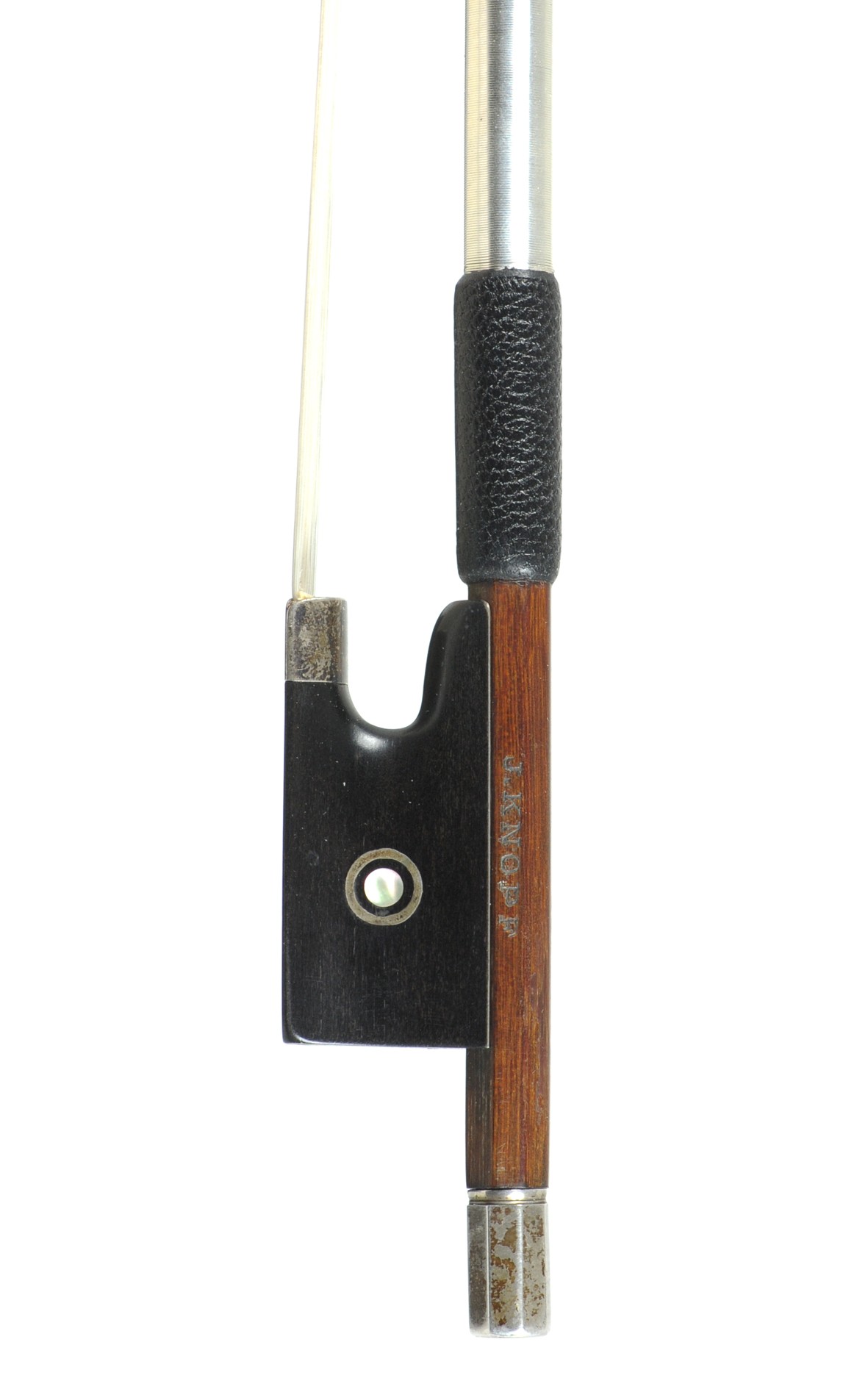 This exzellent silver mounted violin bow with a large matured sound is a fine piece of work of the Knopf school Markneukirchen. The Knopfs are a family of bow makers with long tradition, the ancestor is the Markneukirchen local Christian Wilhelm Knopf. This exzellent violin bow stamped J. Knopf is pristine condition. The strong, yet active round stick is made of red brown pernambuco wood of the finest quality. The delicate ebony frog is silver mounted and decorated with a Parisian eye and an attractive pearl slide. The bow measures 74,5 cm and has its felt balance-point in the center. The measured balance-point is at 24.9 cm including the adjuster. This silver mounted J. Knopf violin bow has excellent tonal and playing qualities and deserves our special recommendation.