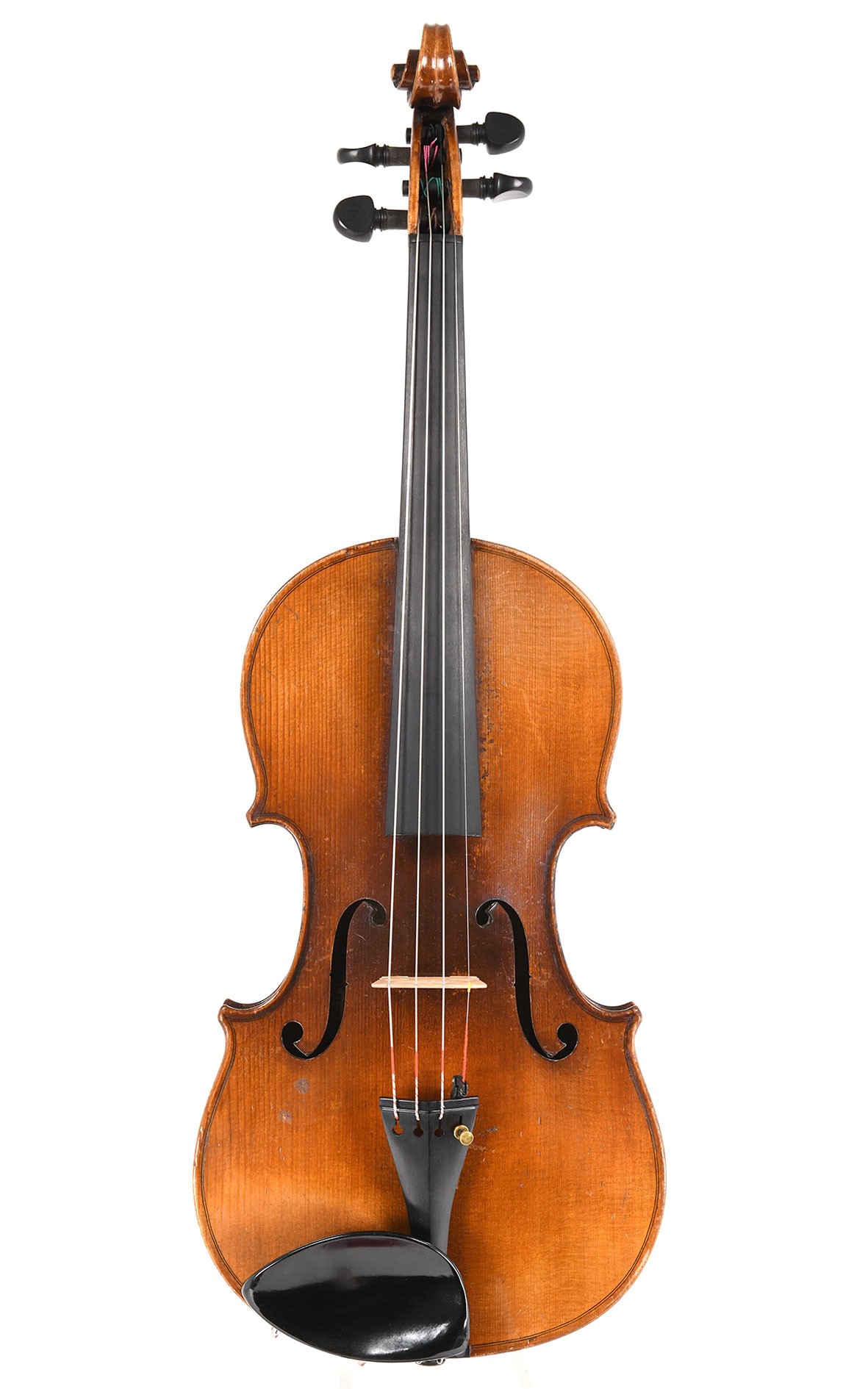 A magnificent old violin with an outstanding sound - the instrument in Tiefenbrucker design was made in Mirecourt at the end of the 19th century: A flat model with a gentle cove and careful inlays and decorations. The top wood of the two-piece top is medium grained spruce, the one-piece back is deeply flamed maple. The transparent antiqued varnish is an orange-brown luminous varnish,...