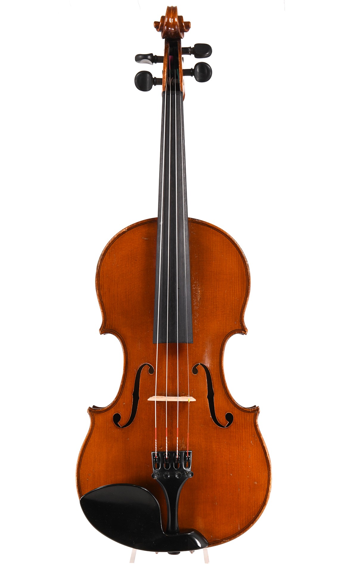 A Bohemian luthier crafted this interesting old violin early in the 20th century around 1920; its individual aesthetics reveal fine Italian influences, which are expressed especially in the choice of wood -probably sycamore-, the stylishly carved scroll and the accentuated edge. Good craftsmanship is demonstrated by the one-piece maple back with its flowing flames, and the concisely...