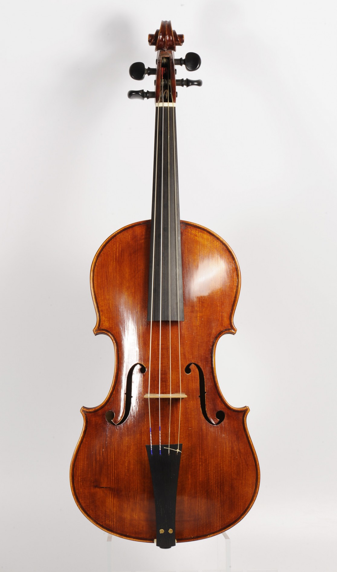 A contemporary baroque violin made by Arthur Bay, Heiligenberg. The instrument was made in 1991 in Heiligenberg, Southern Germany. Arthur Bay studied the art of violin making in Scotland and worked with van Dijk, Deisendorf and Hamma & Co., Stuttgart. The instrument is a fine masterpiece on the model of Stradivarius. The construction follows the early baroque style, the setup with a baroque bridge, gut strings and bone saddles. The top is made of medium grained spruce, the one piece back of mildly flamed maple. The soft varnish is of an intense red/brown color. The inlaid purfling is set close to the edges, which are accentuated. The clear sound is warm, well-balanced, full-bodied and might be described as nuttily. The instrument is offered by the maker and is excluded from the trade-guarantee.