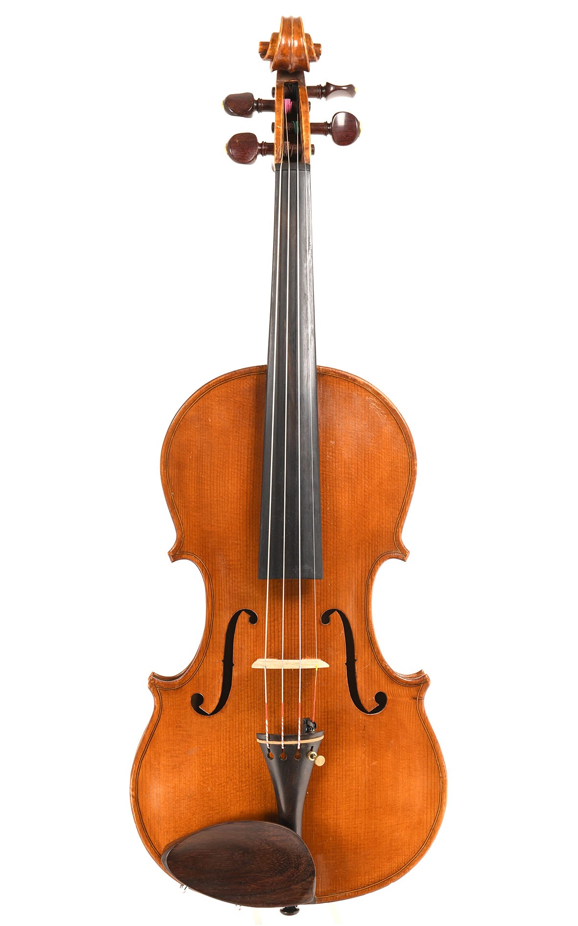 This unique violin by English violin maker Dominique Vlummens, bearing the original dated label, was made in London in 1925. The workmanship and the materials of this interesting English violin are of premium quality: the violin top is made of medium-grained spruce, the two-piece back of deeply flamed maple - typcial woods used in English violin making. With characteristic corners, narrow soundholes and protrudingly wide bouts this violin has a highly individual shape. Especially noteworthy is the hidden beauty of the thinly applied varnish with regard to its high transparency, luminescence and its marvelous patina. In spite of its age this crackfree violin remains perfectly preserved. Her sound is of quality and unique character: bright, warm, strong, silvery and with a delightful noblesse. This violin has a special character sound of colors and beautul roundness. Like all violins from us, luthier-set up and ready to play.