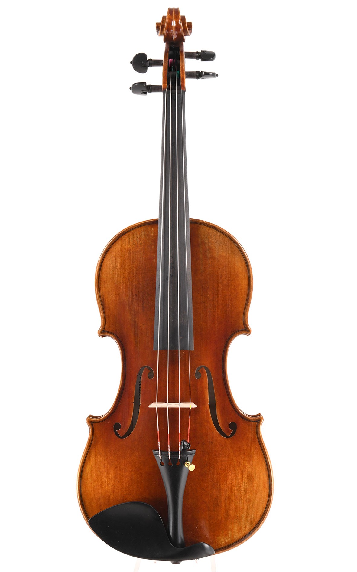 This good violin after Guarnerius, built in 2008, is a new instrument with an exceptionally good and mature sound, full of character and resonance, well-balanced across the strings. This modern violin is a work of good craftsmanship, following the patterns of the Giuseppe Guarneri del Gesu Lord Wilton violin. With its transparent and luminous orange-brown oil varnish over a golden yellow ground, showing no trace of use, this powerful violin is of a very attractive appearance. It has been set up and worked over meticulously by our luthiers and is, like all violins from us offered in immediate playing condition.