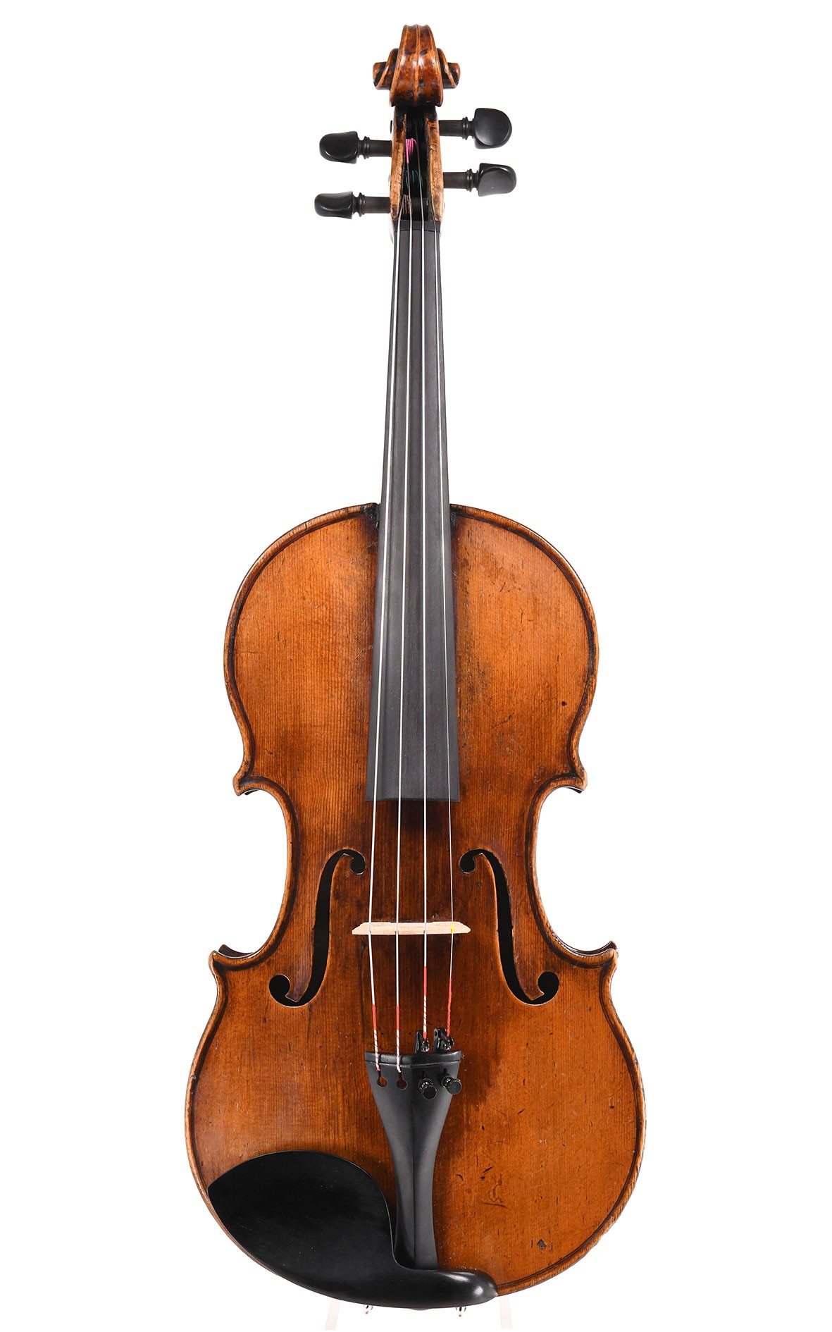 This fine French master violin is the work of a mature master's experienced hand and communicates a unique balance of the finest musical and aesthetic properties. It shows that its maker, we think Jean-Laurent Mast in Toulouse, was, in equal measure, faithful to the classic Mirecourt violin making tradition and independent of it. Trained by Didier Nicolas, one of the most successful masters and entrepreneurs of his day in Mirecourt, Joseph Laurent Mast sought his fortune ― for reasons unknown ― not in his hometown in the Vosges mountains but at the foot of the Pyrenees, where he settled in Toulouse in 1807. The instrument presented here was created around 20 years after Mast established his workshop and serves as a glance at the interim phase of its creator's development; Mast went on to spend another 10 years in the city he chose as his home. The violin’s top-quality tone woods with interesting grain illustrate both Jean-Laurent Mast's sensitivity in choosing his materials as well as the fact that he had a well-sorted selection of woods to draw upon, as should be the case at a well-run workshop. The wonderful one-piece back is a sophisticated and magnificently executed piece of attractively flamed maple which articulates Jean-Laurent Mast's refine stylistic sense just as much as the lovingly crafted scroll does. Offered crackfree in perfect condition this fine violin shows many traces of use by good musicians who apparently played it often and performed challenging literature. Our luthiers carefully set up the violin and made it ready to play so that its truly beautiful rich sound with its rich overtones can present multi-facetted musical options with intense resonance, size and particular warmth in the lower registers. The price includes a certificate by J.-J. Rampal.