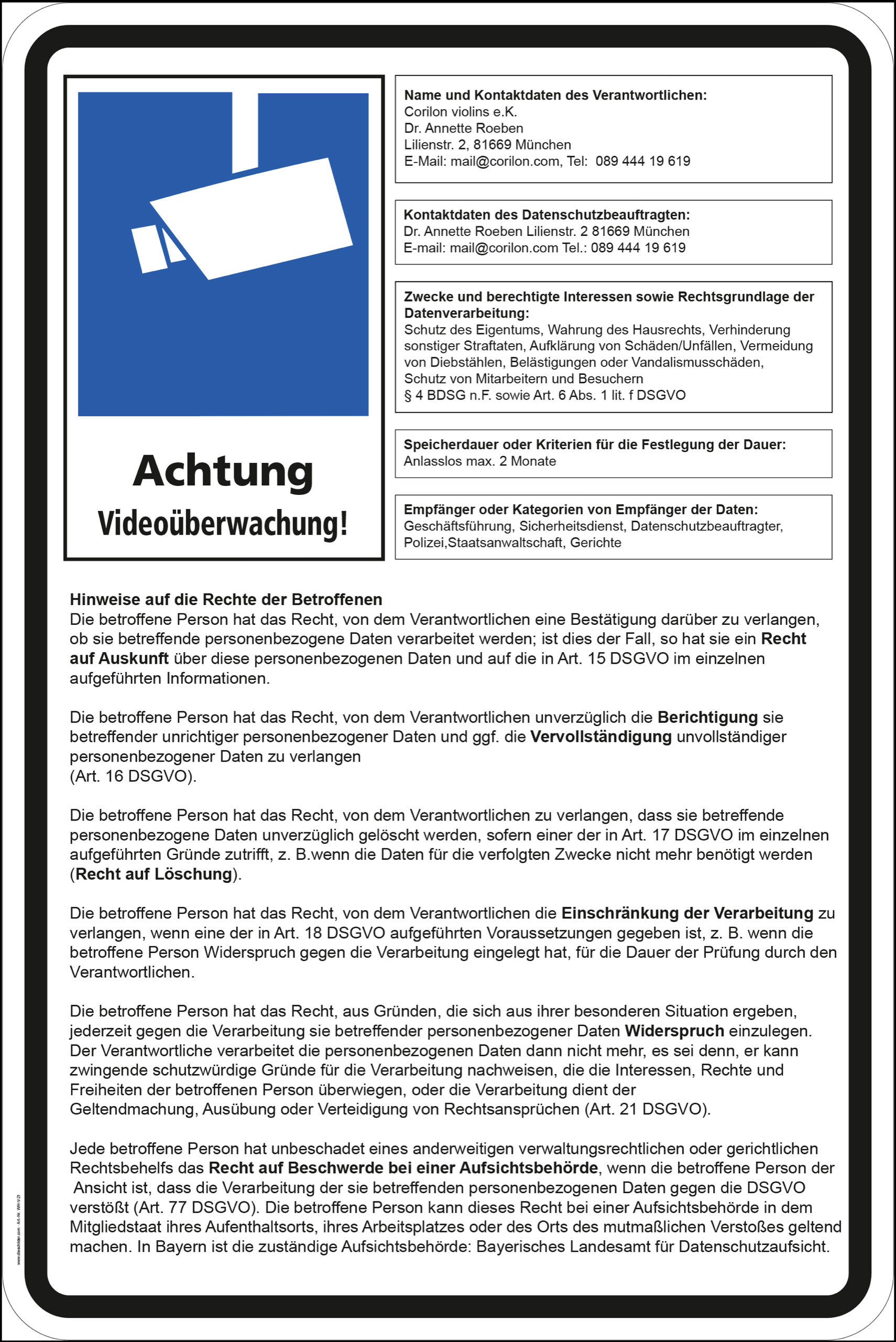 Weitere Hinweise zur Datenerhebung durch Corilon violins GmbH nach Art. 12, 13 Datenschutz-Grundverordnung (DSGVO) zur offenen Videoüberwachung in unseren öffentlichen Geschäftsräumen.