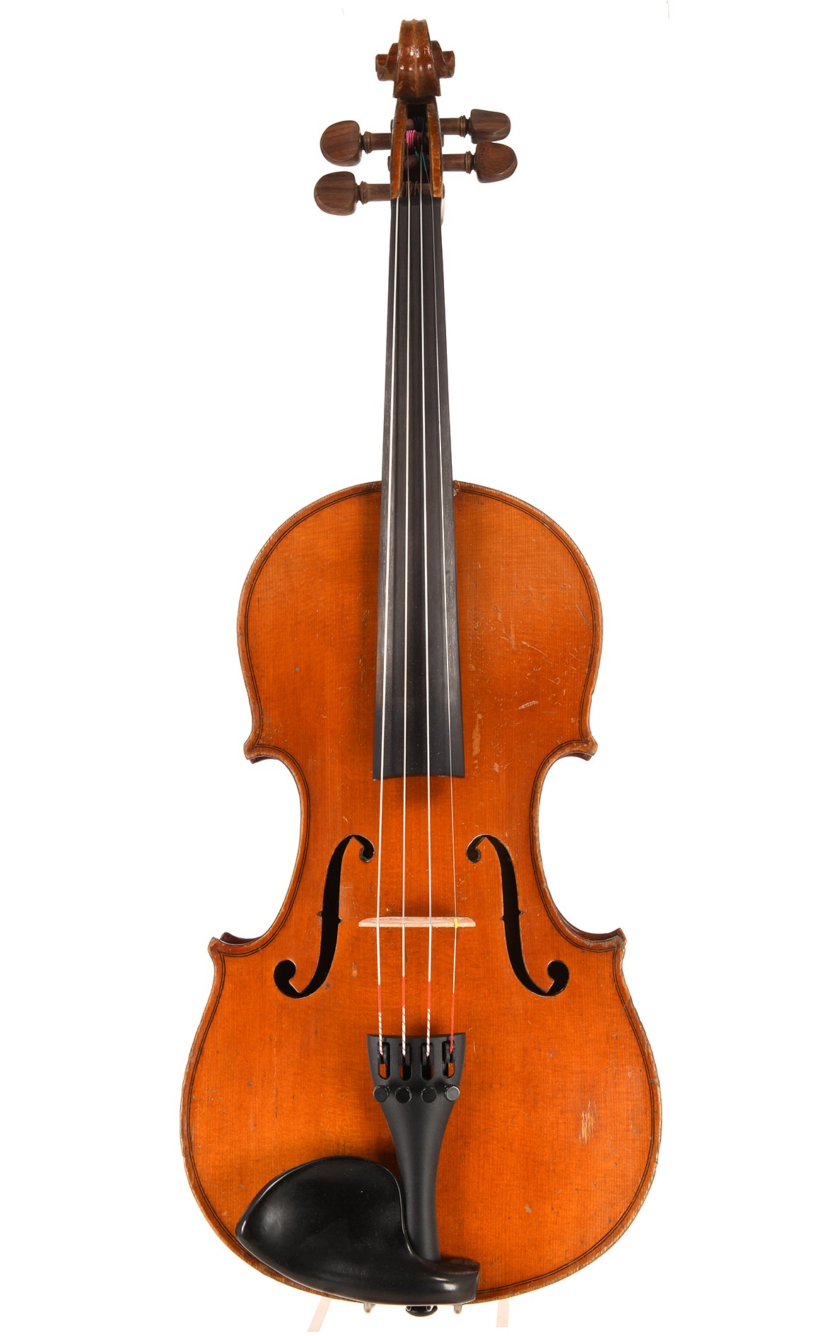 Französische Geige - ein sehr schönes Instrument nach dem Modell H. Derazey das um 1920 im Geigenbauörtchen Mirecourt gebaut wurde. Das mitteljährige Fichtenholz der Decke und die Öllackierung mit angemessener Patina und Spielspuren, tief geflammte Hölzer, und sehr geschmackvoll ausgeführten Ecken und eine große, fein ausgearbeitete Schnecke bestimmen die attraktive Erscheinung der Geige. Sehr schön ausgearbeitet ist die sanfte Wölbung der Decke und des zweiteiligen Bodens. Unverkennbar französischen Charakter strahlt die besonders hübsche Schnecke aus. Wir bieten diese hübsche französische Geige, die bemerkenswert leicht in derr Hand liegt, im Bestzustand rissfrei an, bestens erhalten, spielfertig gründlich aufgearbeitet durch unseren Geigenbauer. Versandkostenfrei mit 30 Tagen Rückgaberecht, optionalem Zertifikat und unbegrenzter Inzahlungnahme-Garantie.